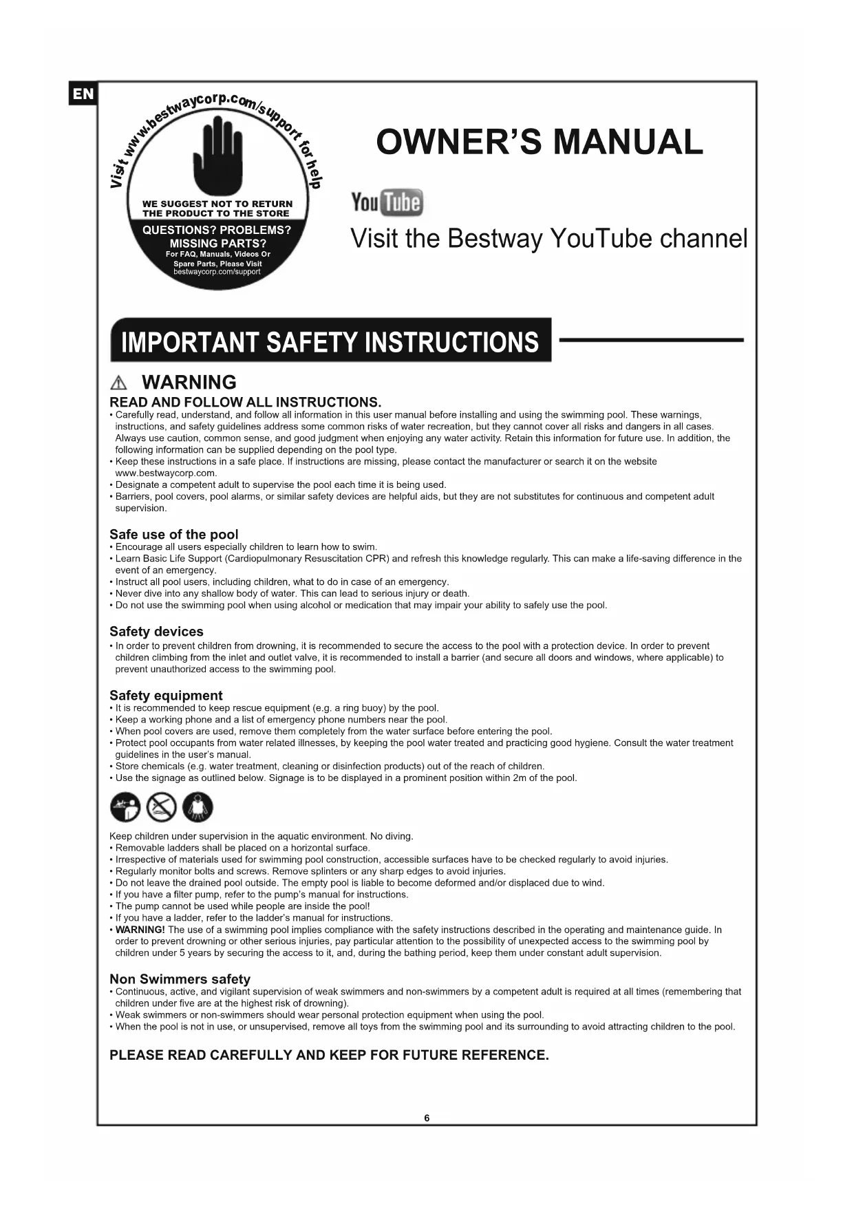Visit the Bestway YouTube channel WE SUGGEST NOT TO RETURNTHE PRODUCT TO THE STOREQUESTIONS? PROBLEMS?MISSING PARTS? For FAQ, Manuals, Videos Or Spare Parts, Please Visitbestwaycorp.com/support
