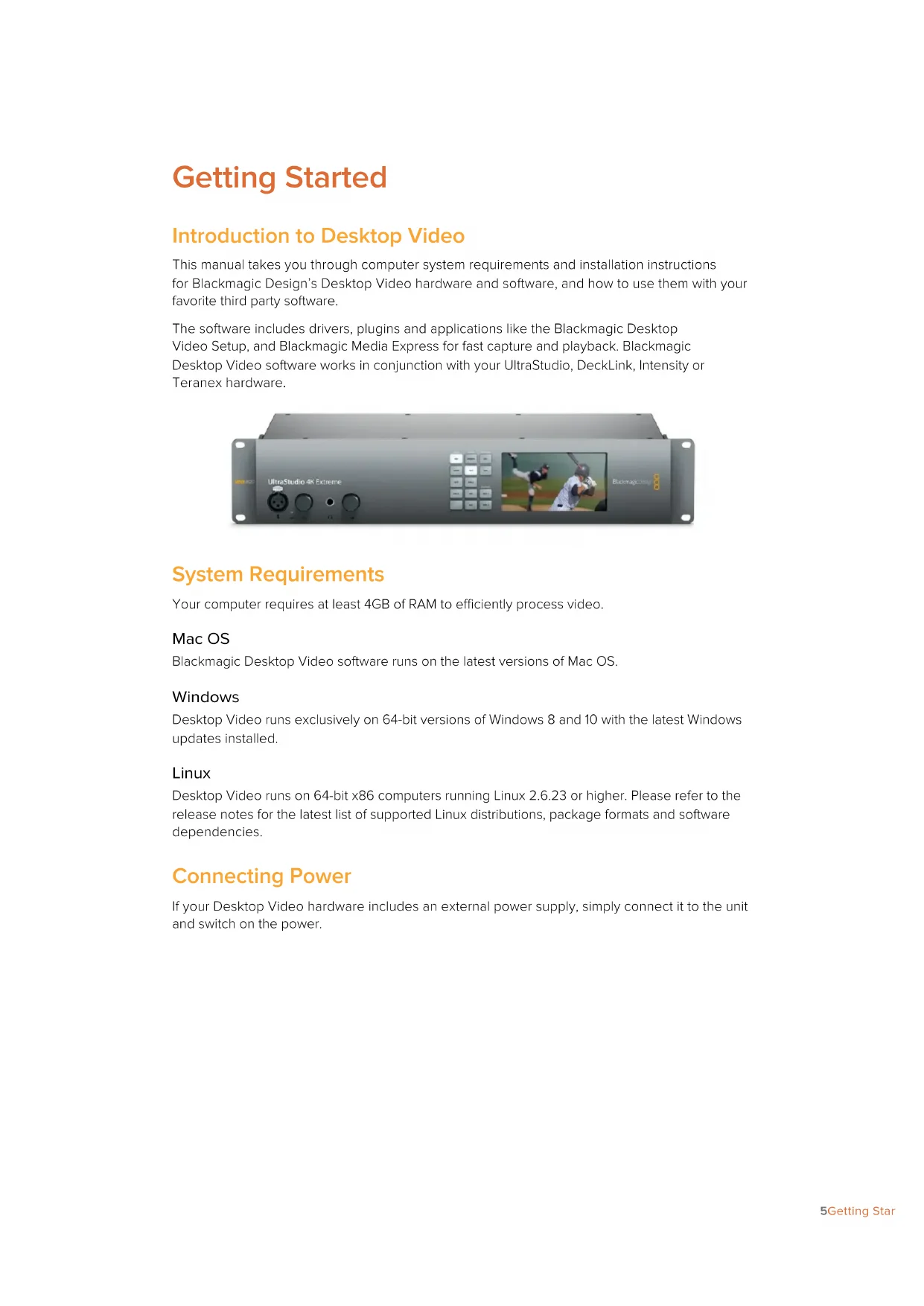 Connecting a SuperSpeed USB 3.0 cable to Intensity Shuttle Connecting via PCIe Blackmagic Design PCIe cards plug into a PCIe slot in your computer. Check the information printed on your card’s box to determine the number of PCIe lanes your card requires. Forexample, depending on your PCIe card, it will require a x1, x4 or x8 PCIe slot. It’s worth noting that you can insert PCIe cards into higher capacity slots than they require. Forexample, a x4 lane PCIe card can be inserted into a x16 lane PCIe slot, though not the other way around. If you can’t find the information you need on the box, you can find the number of lanes yourcard requires, plus other helpful information about your card, in the tech specs at www.blackmagicdesign.com/products 7Getting StartedInstall a Blackmagic Design PCIe card in a spare PCIe slot. If your card includes an HDMI bracket, it can be installed in any spare PCIe mount and connects to the rear of the card with the supplied HDMI cables. If your card includes a breakout cable, simply plug it into your card’s breakout cable connector. Please be careful when installing your DeckLink PCIe card toavoiddamaging delicate components on the card. 8Getting StartedConnecting UltraStudio 4K Extreme via PCIe UltraStudio 4K Extreme and UltraStudio 4K Extreme 3 can also connect to your computer via PCIe using a PCIe adapter card and cable. Both UltraStudio 4K Extreme and UltraStudio 4K Extreme 3 need to be connected to a PCIe Gen 2 slot in your computer. The Blackmagic PCIe Cable Kit contains a PCIe cable and the PCIe adapter card and is available from your nearest Blackmagic Design reseller. For the original UltraStudio 4K Extreme, you can use either the Blackmagic PCIe Cable Kit, or purchase a standard PCIe adapter card from your nearest computer store. UltraStudio 4K Extreme features a PCIe port for connection to an external PCIe adapter card that is installed in your computer The PCIe adapter card is inserted into a PCIe Gen 2 slot inside your computer Connect the other end of the PCIe cable to the PCIe port located at the back of your computer 9Getting StartedInstalling the Desktop Video Software Applications, Plugins and Drivers The Blackmagic Design Desktop Video software includes all the drivers, plugins and applications needed to use your Desktop Video hardware. Below is a list that shows all the software items that are installed on your computer. Mac OS Windows Linux Blackmagic Desktop Video drivers Blackmagic Desktop Video drivers Blackmagic Desktop Video drivers Blackmagic Desktop Video Setup Blackmagic Desktop Video Setup Blackmagic Desktop Video Setup Blackmagic Design LiveKey Blackmagic Design LiveKey – Blackmagic Media Express Blackmagic Media Express Blackmagic Media Express Blackmagic QuickTime™ codecs Blackmagic AVI and QuickTime™ codecs