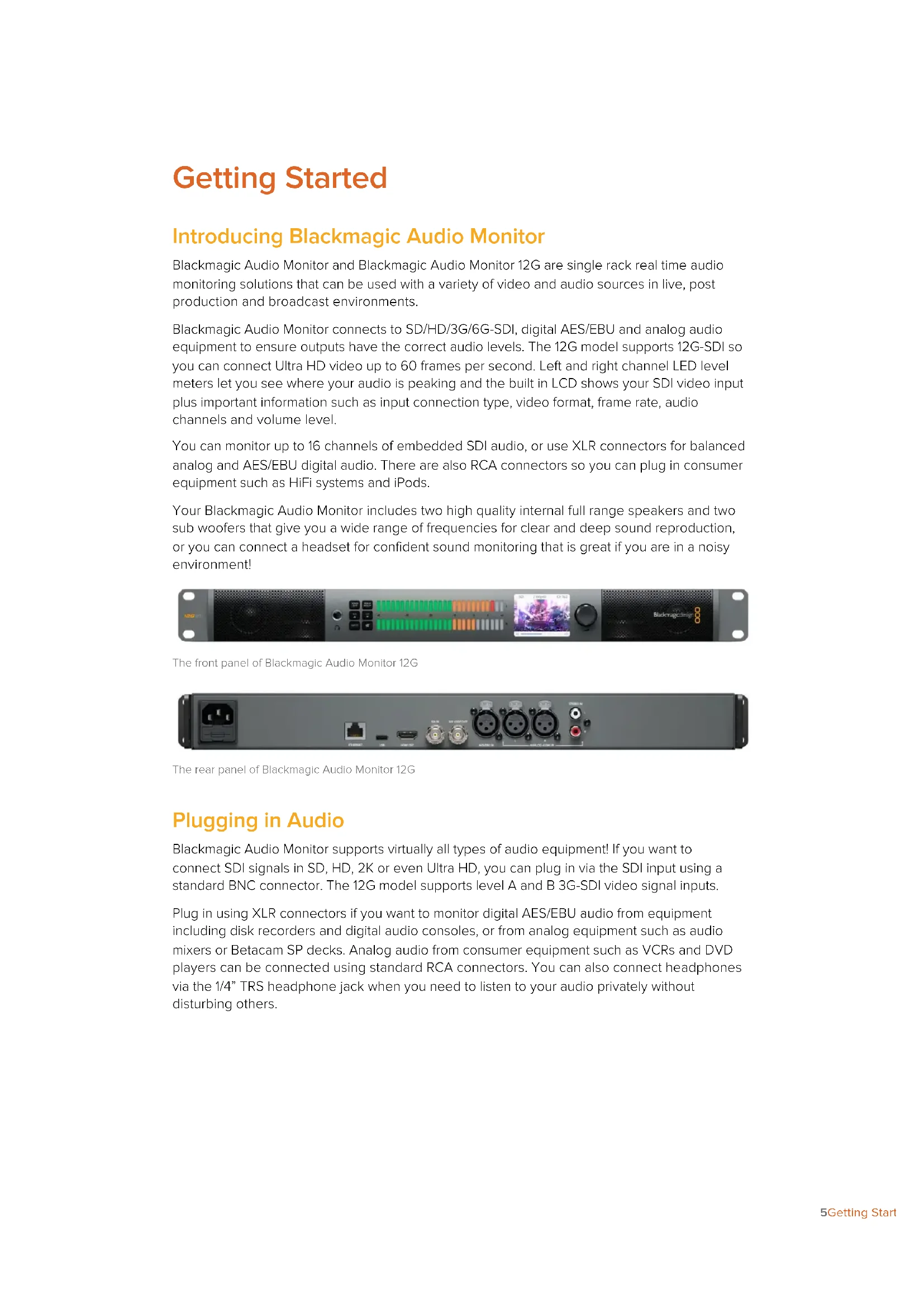 Decoder Module 14 Installing the Module 14 Confirming Dolby Audio 15 Developer Information 16 Controlling Blackmagic Audio Monitor 12G using Telnet 16 Blackmagic Audio Monitor 12G Ethernet Protocol V1.0 16 Help 20 Regulatory Notices 21 Safety Information 22 Warranty 23 4Getting Started Introducing Blackmagic Audio Monitor Blackmagic Audio Monitor and Blackmagic Audio Monitor 12G are single rack real time audio monitoring solutions that can be used with a variety of video and audio sources in live, post production and broadcast environments. Blackmagic Audio Monitor connects to SD/HD/3G/6G-SDI, digital AES/EBU and analog audio equipment to ensure outputs have the correct audio levels. The 12G model supports 12G-SDI so you can connect Ultra HD video up to 60 frames per second. Left and right channel LED level meters let you see where your audio is peaking and the built in LCD shows your SDI video input plus important information such as input connection type, video format,frame rate, audio channels and volume level. You can monitor up to 16 channels of embedded SDI audio, or use XLR connectors for balanced analog and AES/EBU digital audio.There are also RCA connectors so you can plug in consumer equipment such as HiFi systems and iPods. Your Blackmagic Audio Monitor includes two high quality internal full range speakers and two sub woofers that give you a wide range of frequencies for clear and deep sound reproduction, or you can connect a headset for confident sound monitoring that is great if you are in a noisy environment! The front panel of Blackmagic Audio Monitor 12G The rear panel of Blackmagic Audio Monitor 12G Plugging in Audio Blackmagic Audio Monitor supports virtually all types of audio equipment! If you want to connect SDI signals in SD, HD, 2K or even Ultra HD, you can plug in via the SDI input using a standard BNC connector. The 12G model supports level A and B 3G-SDI video signal inputs. Plug in using XLR connectors if you want to monitor digital AES/EBU audio from equipment including disk recorders and digital audio consoles, or from analog equipment such as audio mixers or Betacam SP decks. Analog audio from consumer equipment such as VCRs and DVD players can be connected using standard RCA connectors. You can also connect headphones via the 1/4” TRS headphone jack when you need to listen to your audio privately without disturbing others. 5Getting Started1. HDMI 2. SDI embedded audio 3. XLR for AES/EBU