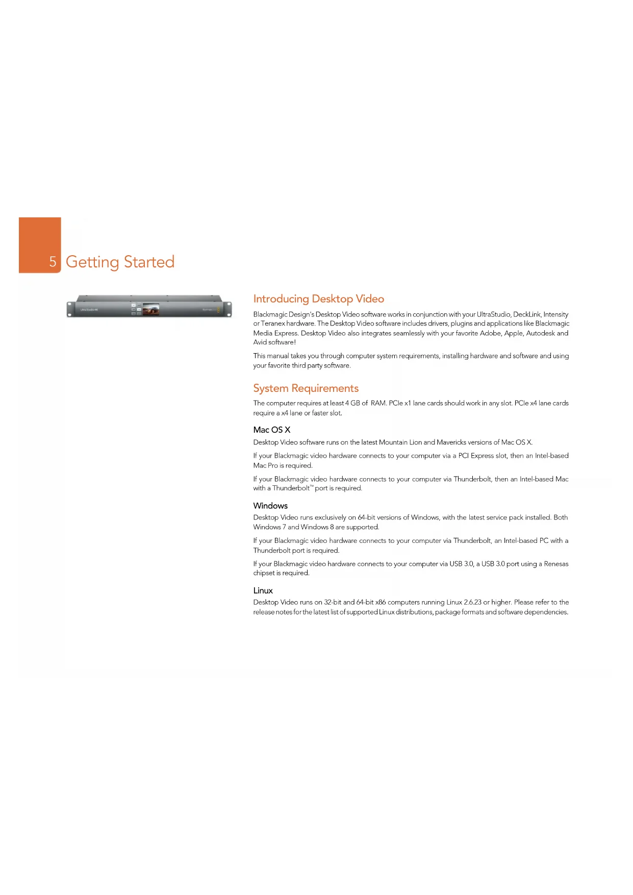 port is required. Windows Desktop Video runs exclusively on 64-bit versions of Windows, with the latest service pack installed. Both Windows 7 and Windows 8 are supported. If your Blackmagic video hardware connects to your computer via Thunderbolt, an Intel-based PC with a Thunderbolt port is required. If your Blackmagic video hardware connects to your computer via USB 3.0, a USB 3.0 port using a Renesas chipset is required. Linux Desktop Video runs on 32-bit and 64-bit x86 computers running Linux 2.6.23 or higher. Please refer to the release notes for the latest list of supported Linux distributions, package formats and software dependencies. Getting StartedGetting Started