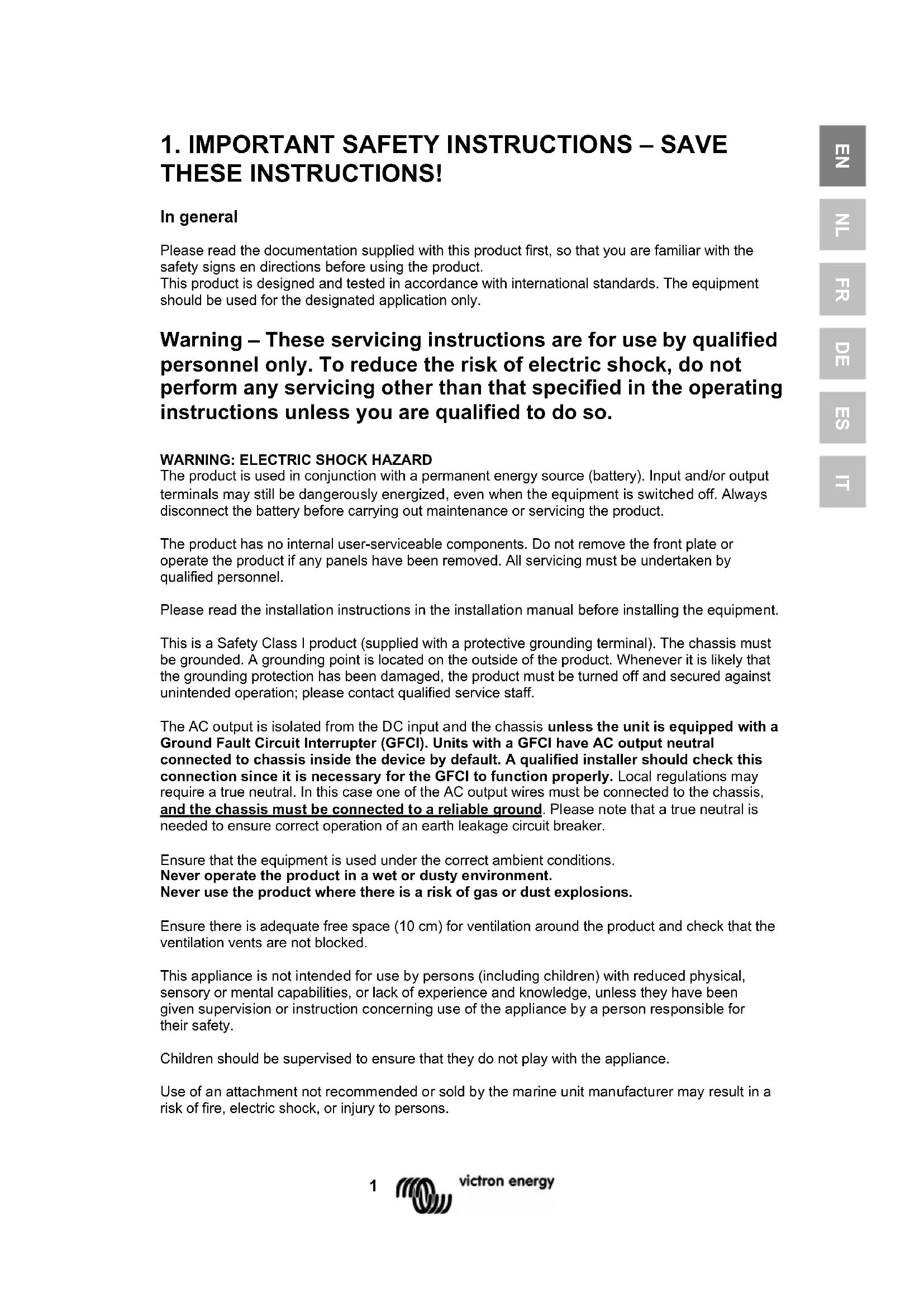 The product is used in conjunction with a permanent energy source (battery). Input and/or output terminals may still be dangerously energized, even when the equipment is switched off. Always disconnect the battery before carrying out maintenance or servicing the product. The product has no internal user-serviceable components. Do not remove the front plate or operate the product if any panels have been removed. All servicing must be undertaken by qualified personnel. Please read the installation instructions in the installation manual before installing the equipment. This is a Safety Class I product (supplied with a protective grounding terminal). The chassis must be grounded. A grounding point is located on the outside of the product. Whenever it is likely that the grounding protection has been damaged, the product must be turned off and secured against unintended operation; please contact qualified service staff. The AC output is isolated from the DC input and the chassis unless the unit is equipped with a Ground Fault Circuit Interrupter (GFCI). Units with a GFCI have AC output neutral connected to chassis inside the device by default. A qualified installer should check this connection since it is necessary for the GFCI to function properly. Local regulations may require a true neutral. In this case one of the AC output wires must be connected to the chassis, and the chassis must be connected to a reliable ground. Please note that a true neutral is needed to ensure correct operation of an earth leakage circuit breaker. Ensure that the equipment is used under the correct ambient conditions. Never operate the product in a wet or dusty environment. Never use the product where there is a risk of gas or dust explosions. Ensure there is adequate free space (10 cm) for ventilation around the product and check that the ventilation vents are not blocked. This appliance is not intended for use by persons (including children) with reduced physical, sensory or mental capabilities, or lack of experience and knowledge, unless they have been given supervision or instruction concerning use of the appliance by a person responsible for their safety. Children should be supervised to ensure that they do not play with the appliance. Use of an attachment not recommended or sold by the marine unit manufacturer may result in a risk of fire, electric shock, or injury to persons.2