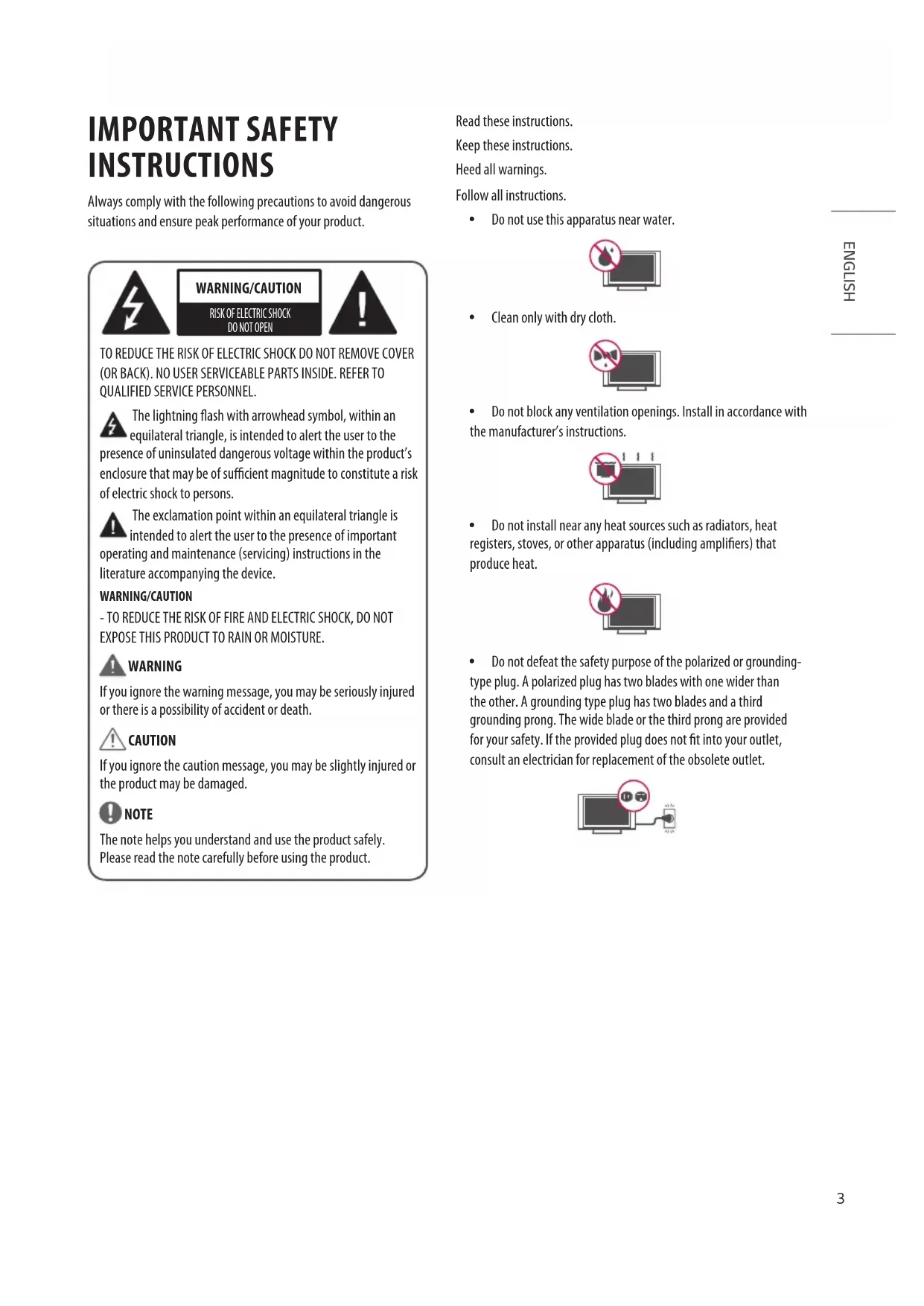 TO REDUCE THE RISK OF ELECTRIC SHOCK DO NOT REMOVE COVER (OR BACK). NO USER SERVICEABLE PARTS INSIDE. REFER TO QUALIFIED SERVICE PERSONNEL. The lightning ash with arrowhead symbol, within an equilateral triangle, is intended to alert the user to the presence of uninsulated dangerous voltage within the product’s enclosure that may be of sucient magnitude to constitute a risk of electric shock to persons. The exclamation point within an equilateral triangle is intended to alert the user to the presence of important operating and maintenance (servicing) instructions in the literature accompanying the device. WARNING/CAUTION - TO REDUCE THE RISK OF FIRE AND ELECTRIC SHOCK, DO NOT EXPOSE THIS PRODUCT TO RAIN OR MOISTURE. WARNING If you ignore the warning message, you may be seriously injured or there is a possibility of accident or death. CAUTION If you ignore the caution message, you may be slightly injured or the product may be damaged. NOTE The note helps you understand and use the product safely. Please read the note carefully before using the product. Read these instructions. Keep these instructions. Heed all warnings. Follow all instructions. y Do not use this apparatus near water. y Clean only with dry cloth. y Do not block any ventilation openings. Install in accordance with the manufacturer’s instructions. y Do not install near any heat sources such as radiators, heat registers, stoves, or other apparatus (including ampliers) that produce heat. y Do not defeat the safety purpose of the polarized or grounding- type plug. A polarized plug has two blades with one wider than the other. A grounding type plug has two blades and a third grounding prong. The wide blade or the third prong are provided for your safety. If the provided plug does not t into your outlet, consult an electrician for replacement of the obsolete outlet.