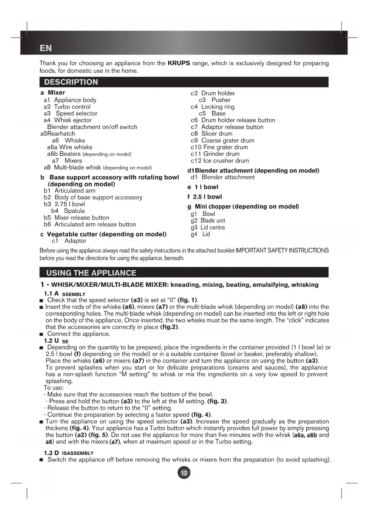 Thank you for choosing an appliance from the KRUPS range, which is exclusively designed for preparing foods, for domestic use in the home. DESCRIPTION a Mixer a1 Appliance body a2 Turbo control a3 Speed selector a4 Whisk ejector Blender attachment on/off switch a5 Rear hatch a6 Whisks a6a Wire whisks a6b Beaters (depending on model) a7 Mixers a8 Multi-blade whisk (depending on model) b Base support accessory with rotating bowl (depending on model) b1 Articulated arm b2 Body of base support accessory b3 2.75 l bowl b4 Spatula b5 Mixer release button b6 Articulated arm release button c Vegetable cutter (depending on model) c1 Adaptor c2 Drum holder c3 Pusher c4 Locking ring c5 Base c6 Drum holder release button c7 Adaptor release button c8 Slicer drum c9 Coarse grater drum c10 Fine grater drum c11 Grinder drum c12 Ice crusher drum d1 Blender attachment (depending on model) d1 Blender attachment e 1 l bowl f 2.5 l bowl