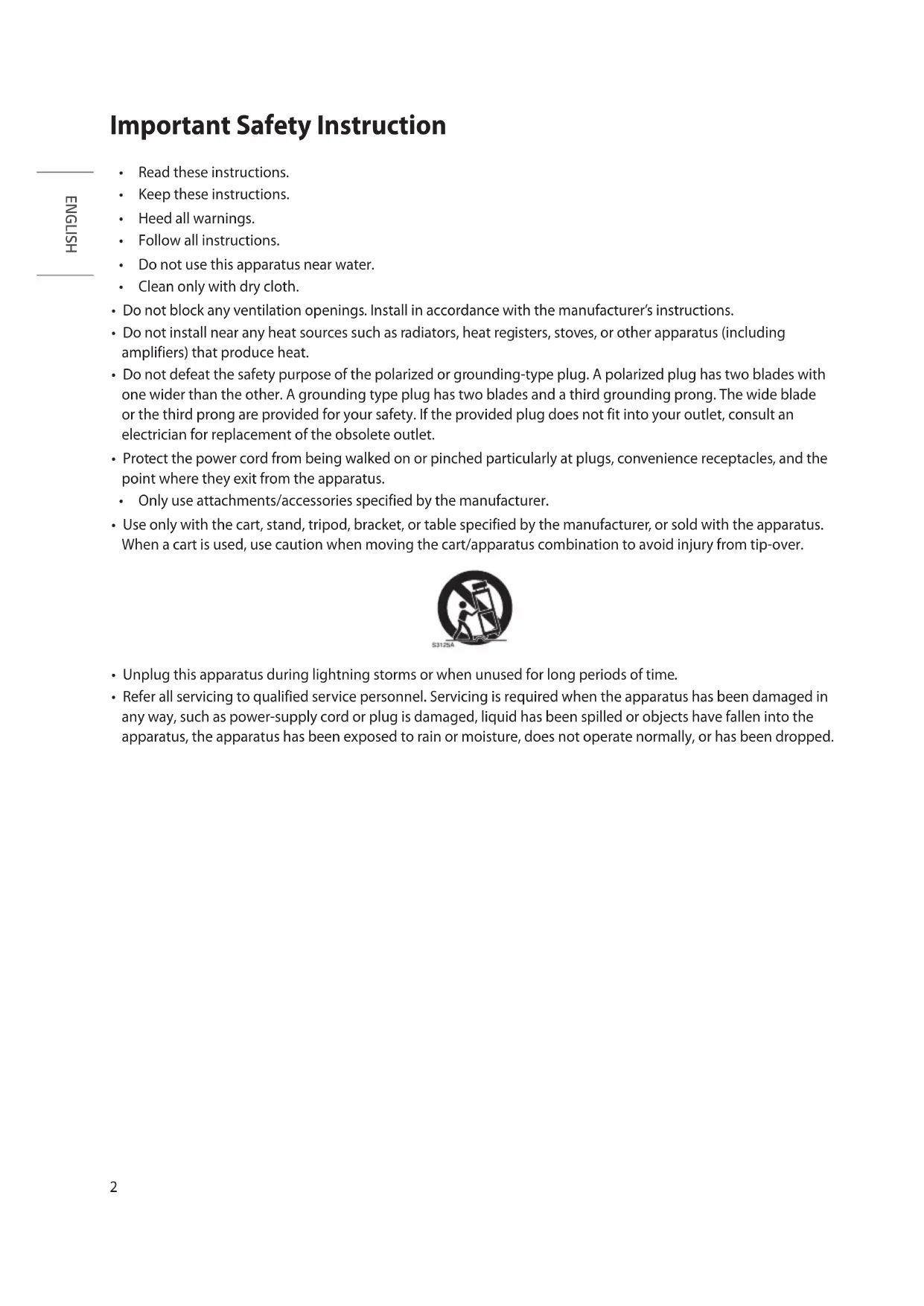 - Use only with the cart, stand, tripod, bracket, or table specified by the manufacturer, or sold with the apparatus. When a cart is used, use caution when moving the cart/apparatus combination to avoid injury from tip-over.