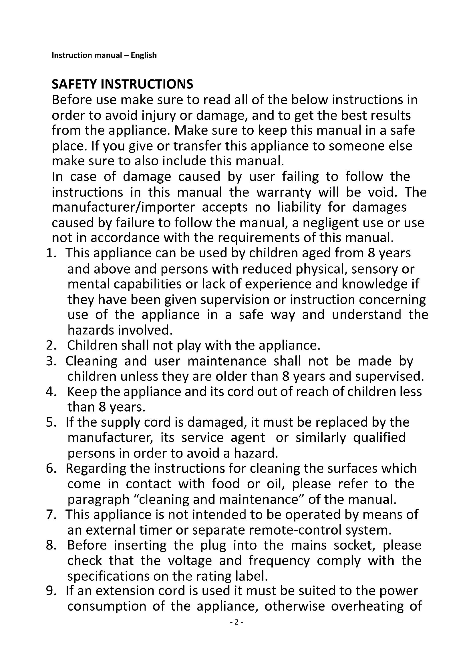 Content – Inhalt – Teneur – Inhoud – Treść Instruction manual – English ...................................................................................... - 2 - Bedienungsanleitung – German ............................................................................... - 11 - Mode d‘emploi – French .......................................................................................... - 20 - Gebruiksaanwijzing – Dutch ..................................................................................... - 29 - Instrukcja obsługi – Polish ........................................................................................ - 38 -- 2 - Instruction manual – English SAFETY INSTRUCTIONS Before use make sure to read all of the below instructions in order to avoid injury or damage, and to get the best results from the appliance. Make sure to keep this manual in a safe place. If you give or transfer this appliance to someone else make sure to also include this manual. In case of damage caused by user failing to follow the instructions in this manual the warranty will be void. The manufacturer/importer accepts no liability for damages caused by failure to follow the manual, a negligent use or use not in accordance with the requirements of this manual.