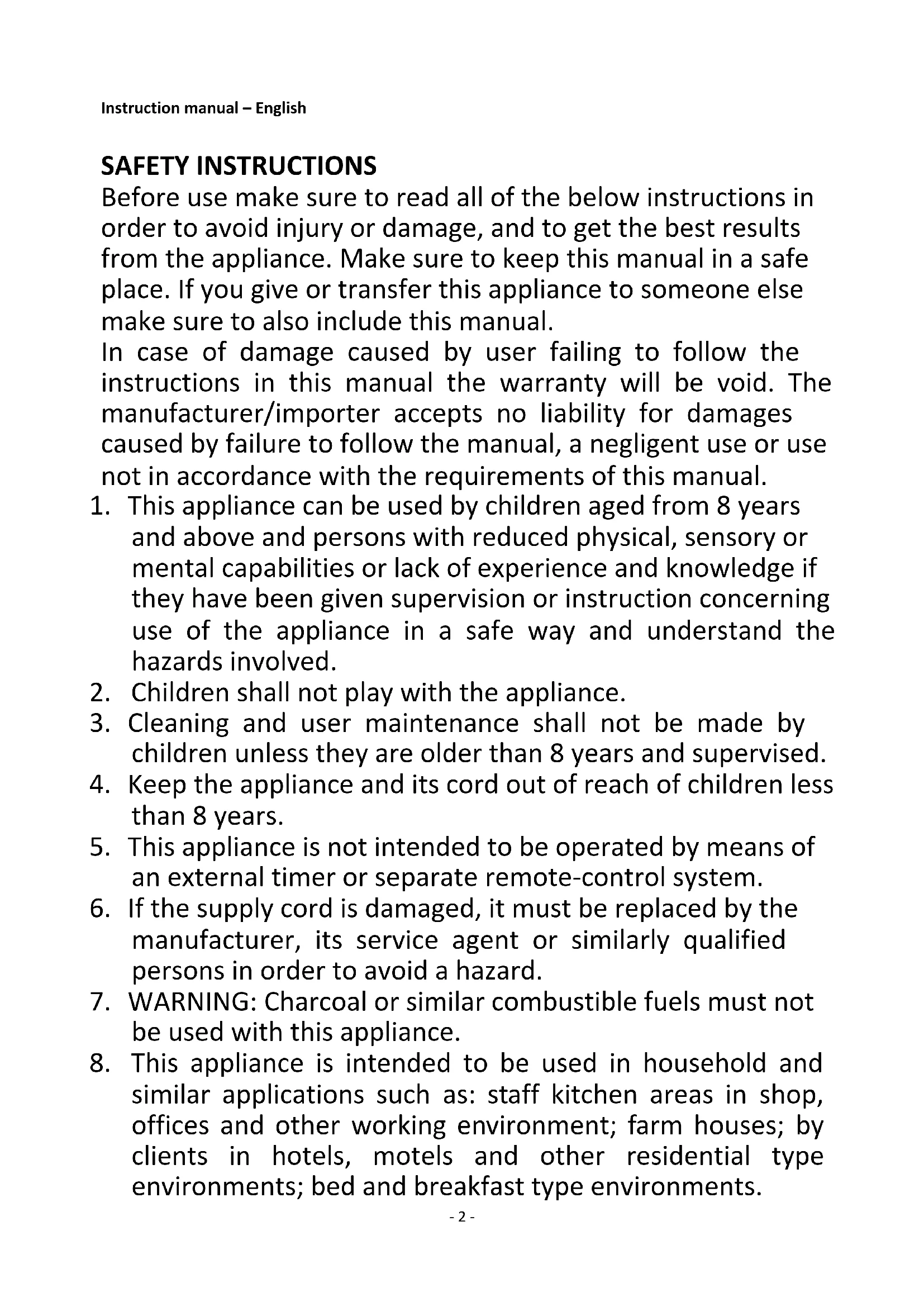 10. The appliance may be used only for its intended purpose.