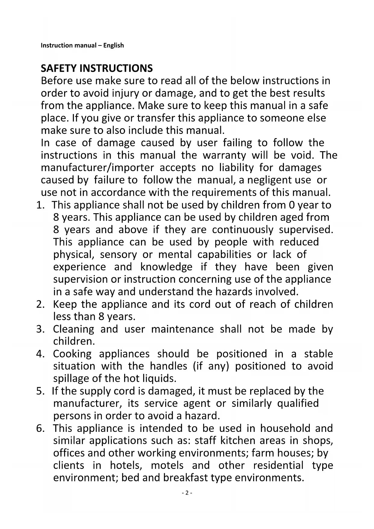 Before delivery our devices are subjected to rigorous quality control. If, despite all care, damage has occurred during production or transportation, please return the device to your dealer. In addition to statutory legal rights, the purchaser has an option to claim under the terms of the following guarantee: For the purchased device we provide 2 years guarantee, commencing from the day of sale. If you have a defective product, you can directly go back to the point of purchase. Defects which arise due to improper handling of the device and malfunctions due to interventions and repairs by third parties or the fitting of non-original parts are not covered by this guarantee. Always keep your receipt, without the receipt you can’t claim any form of warranty. Damage caused by not following the instruction manual, will lead to a void of warranty, if this results in consequential damages then we will not be liable. Neither can we hold responsible for material damage or personal injury caused by improper use if the instruction manual is not properly executed. Damage to accessories does not mean free replacement of the whole appliance. In such case please contact our service department. Broken glass or breakage of plastic parts is always subject to a charge. Defects to consumables or parts subjected to wearing, as well as cleaning, maintenance or the replacement of said parts are not covered by the warranty and are to be paid.