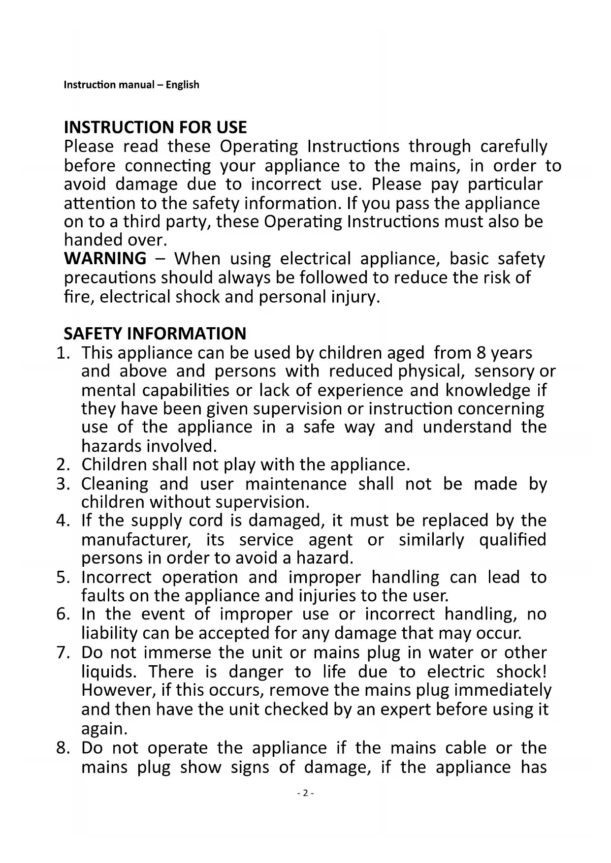Please read these Operating Instructions through carefully before connecting your appliance to the mains, in order to avoid damage due to incorrect use. Please pay particular attention to the safety information. If you pass the appliance on to a third party, these Operating Instructions must also be handed over. WARNING – When using electrical appliance, basic safety precautions should always be followed to reduce the risk of fire, electrical shock and personal injury. SAFETY INFORMATION