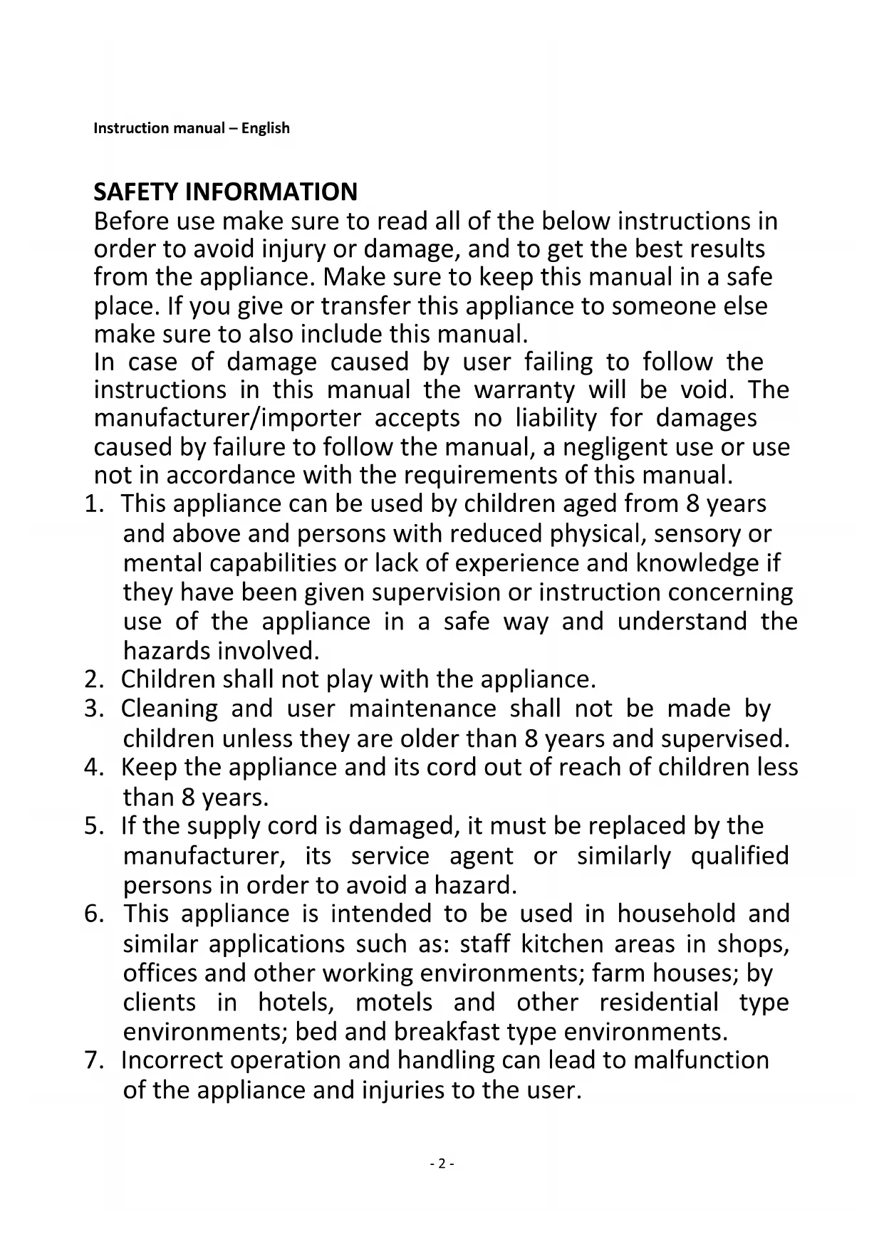 Before delivery our devices are subjected to rigorous quality control. If, despite all care, damage has occurred during production or transportation, please return the device to your dealer. In addition to statutory legal rights, the purchaser has an option to claim under the terms of the following guarantee: For the purchased device we provide 2 years guarantee, commencing from the day of sale. If you have a defective product, you can directly go back to the point of purchase. Defects which arise due to improper handling of the device and malfunctions due to interventions and repairs by third parties or the fitting of non-original parts are not covered by this guarantee. Always keep your receipt, without the receipt you can’t claim any form of warranty. Damage caused by not following the instruction manual, will lead to a void of warranty, if this results in consequential damages then we will not be liable. Neither can we hold responsible for material damage or personal injury caused by improper use if the instruction manual is not properly executed. Damage to accessories does not mean free replacement of the whole appliance. In such case please contact our service department. Broken glass or breakage of plastic parts is always subject to a charge. Defects to consumables or parts subjected to wearing, as well as cleaning, maintenance or the replacement of said parts are not covered by the warranty and are to be paid.