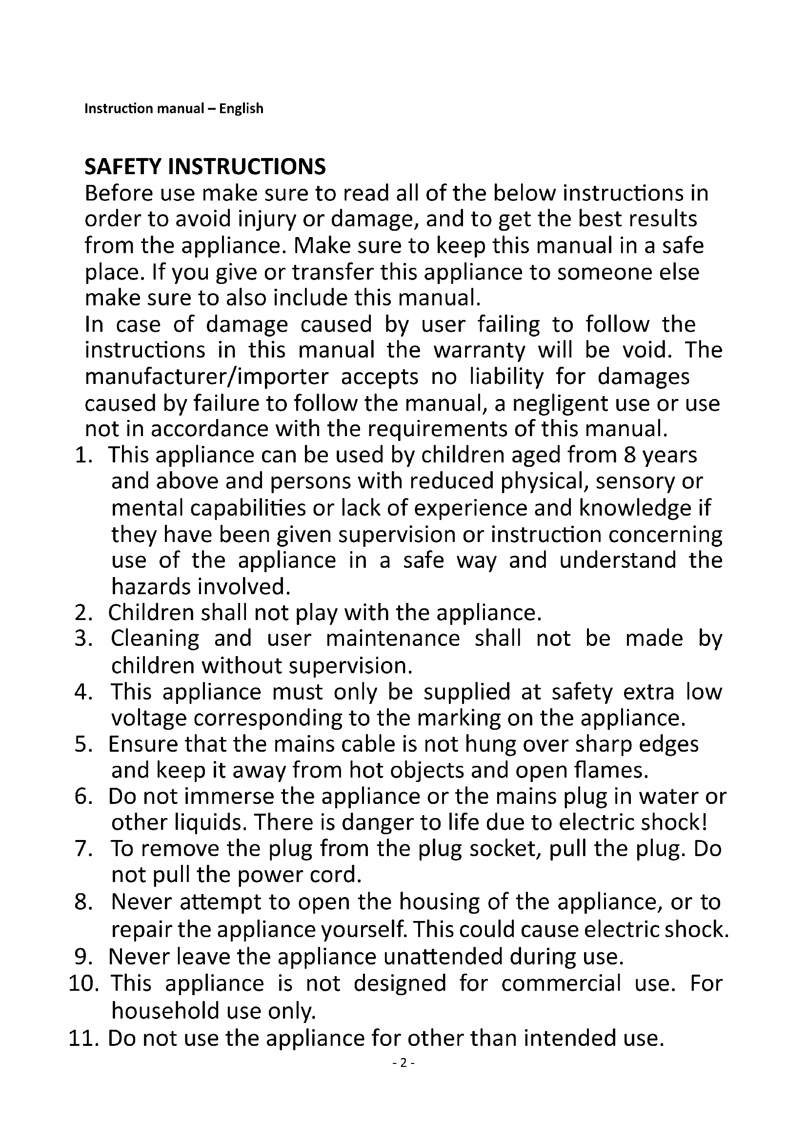 Instruction manual – English ........................................................................................ - 2 - Bedienungsanleitung – Deutsch ................................................................................... - 9 - Mode d‘emploi – Français .......................................................................................... - 16 - Manuale d'istruzioni – Italiano ................................................................................... - 23 -- 2 - Instruction manual – English SAFETY INSTRUCTIONS Before use make sure to read all of the below instructions in order to avoid injury or damage, and to get the best results from the appliance. Make sure to keep this manual in a safe place. If you give or transfer this appliance to someone else make sure to also include this manual. In case of damage caused by user failing to follow the instructions in this manual the warranty will be void. The manufacturer/importer accepts no liability for damages caused by failure to follow the manual, a negligent use or use not in accordance with the requirements of this manual.