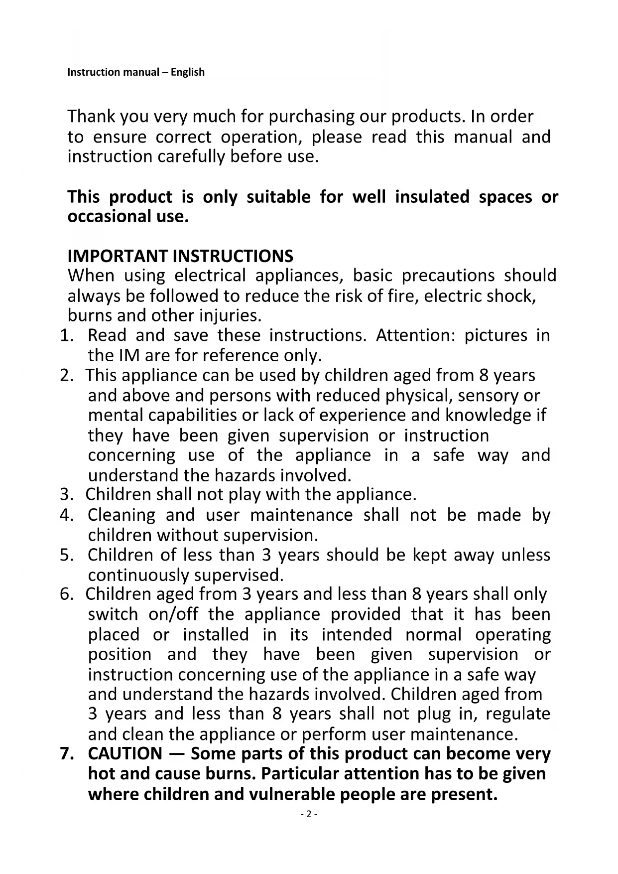 temperature is below the setting, and switch off if it is above the setting. SAFETY SYSTEM ⚫ The appliance has a safety system which automatically switches off the unit when overheated. ⚫ If overheating occurs, switch off the appliance, remove the plug from the socket, and let it cool down for at least 30 minutes. Put the plug in the socket and switch on the heater. ⚫ This heater is equipped with a tilt protection safety device. For safety reasons, the unit will automatically switch off the power if it is put on unstable or uneven surface or if it is tilted accidentally. MAINTENANCE ⚫ The fan heater only needs regular cleaning on the outside. ⚫ Before you clean the unit, turn off the switch. Remove the plug from the socket and wait until the fan heater cools down completely. ⚫ Use a damp cloth to wipe the heater housing. ⚫ Do not use detergents, abrasive cleaning liquids or chemicals (alcohol, gasoline etc.) to clean the appliance. TECHNICAL DATA Operating voltage: 220-240V ~ 50-60Hz Power consumption: 1800-2000W- 7 -