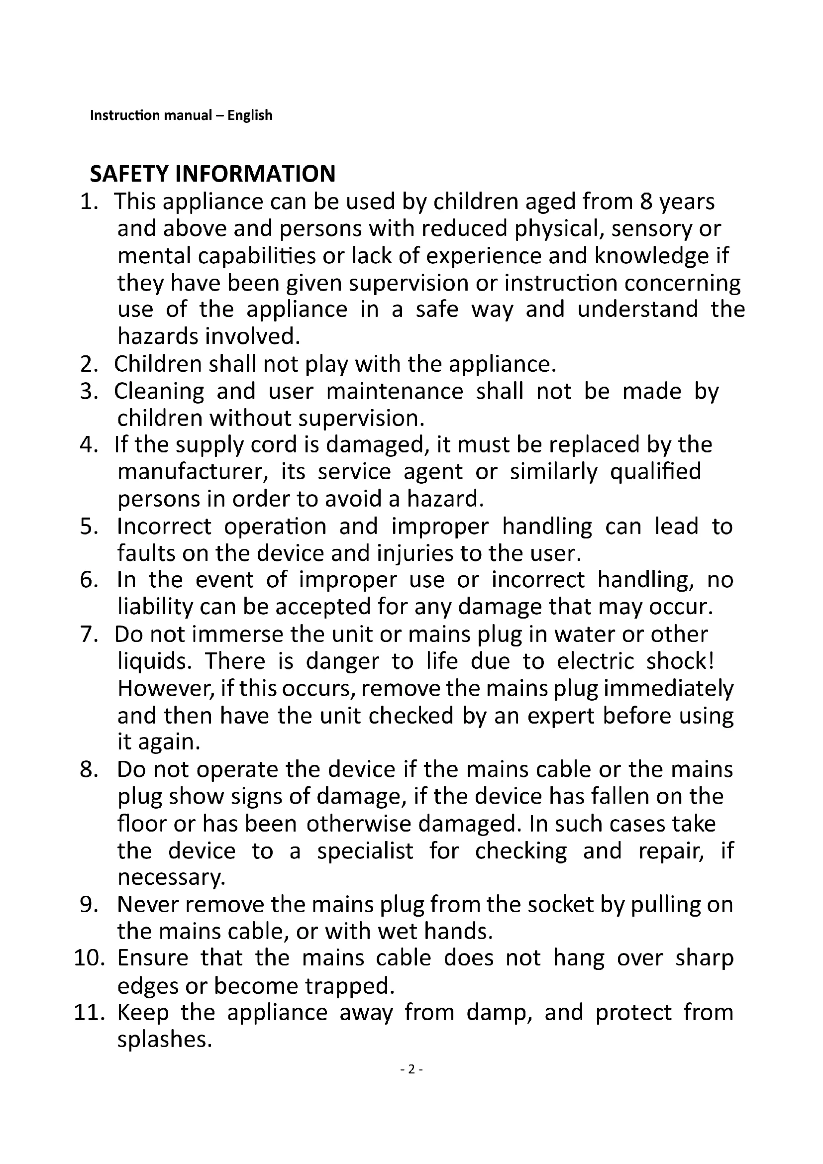 2. Never immerse the appliance in water (danger of short-circuit). To clean the appliance, only wipe it down
