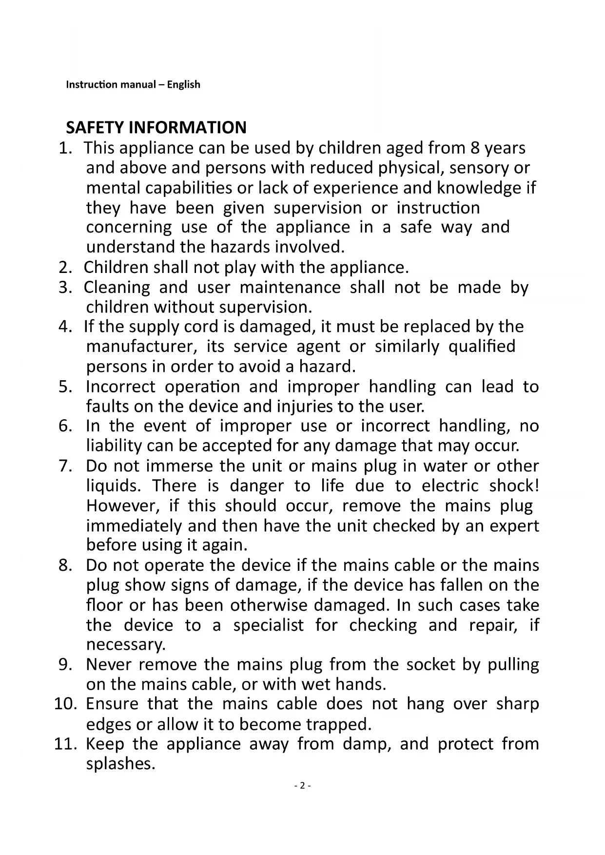 11. Keep the appliance away from damp, and protect from