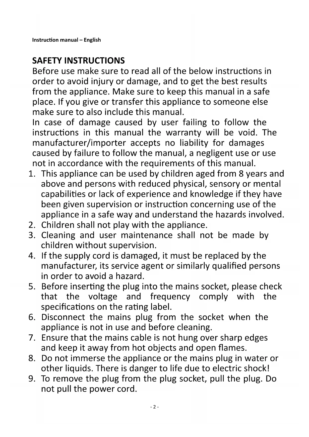Before delivery our devices are subjected to rigorous quality control. If, despite all care, damage has occurred during production or transportation, please return the device to your dealer. In addition to statutory legal rights, the purchaser has an option to claim under the terms of the following guarantee: For the purchased device we provide 2 years guarantee, commencing from the day of sale. If you have a defective product, you can directly go back to the point of purchase. Defects which arise due to improper handling of the device and malfunctions due to interventions and repairs by third parties or the fitting of non-original parts are not covered by this guarantee. Always keep your receipt, without the receipt you can’t claim any form of warranty. Damage caused by not following the instruction manual, will lead to a void of warranty, if this results in consequential damages then we will not be liable. Neither can we hold responsible for material damage or personal injury caused by improper use if the instruction manual is not properly executed. Damage to accessories does not mean free replacement of the whole appliance. In such case please contact our service department. Broken glass or breakage of plastic parts is always subject to a charge. Defects to consumables or parts subjected to wearing, as well as cleaning, maintenance or the replacement of said parts are not covered by the warranty and are to be paid.- 6 -