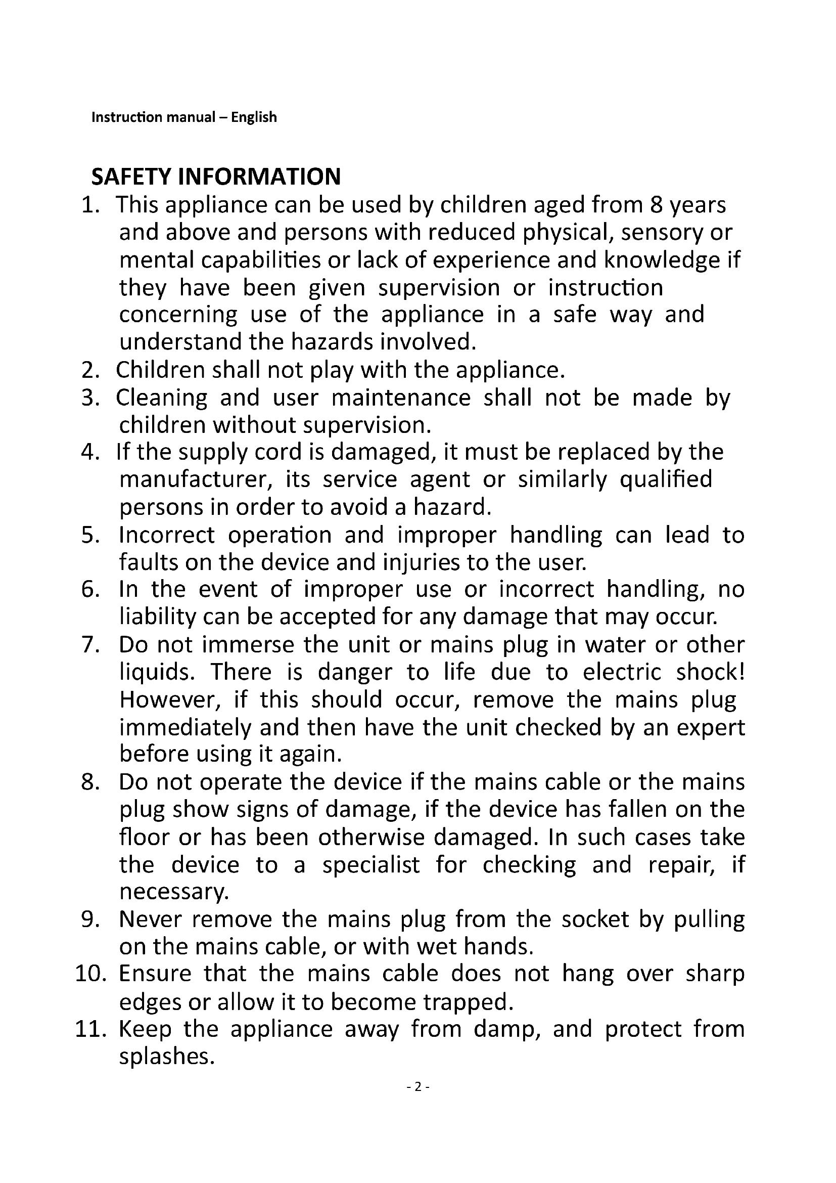 Before delivery our devices are subjected to rigorous quality control. If, despite all care, damage has occurred during production or transportation, please return the device to your dealer. In addition to statutory legal rights, the purchaser has an option to claim under the terms of the following guarantee: For the purchased device we provide 2 years guarantee, commencing from the day of sale. If you have a defective product, you can directly go back to the point of purchase. Defects which arise due to improper handling of the device and malfunctions due to interventions and repairs by third parties or the fitting of non-original parts are not covered by this guarantee. Always keep your receipt, without the receipt you can’t claim any form of warranty. Damage caused by not following the instruction manual, will lead to a void of warranty, if this results in consequential damages then we will not be liable. Neither can we hold responsible for material damage or personal injury caused by improper use if the instruction manual is not properly executed. Damage to accessories does not mean free replacement of the whole appliance. In such case please contact our service department. Broken glass or breakage of plastic parts- 6 - is always subject to a charge. Defects to consumables or parts subjected to wearing, as well as cleaning, maintenance or the replacement of said parts are not covered by the warranty and are to be paid.