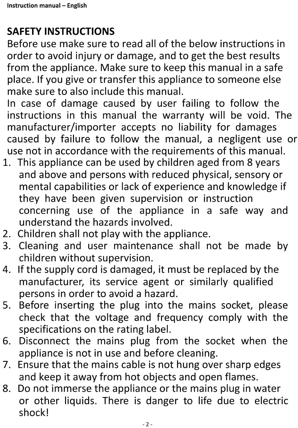 8. Do not immerse the appliance or the mains plug in water