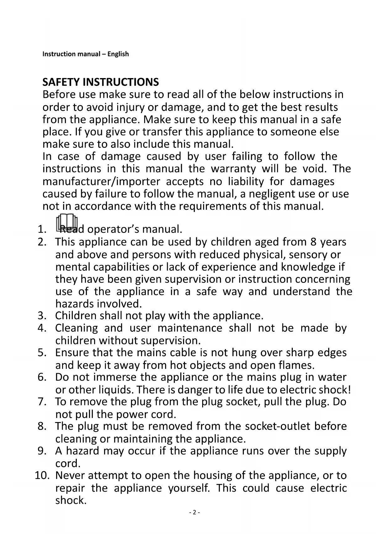 10. Never attempt to open the housing of the appliance, or to