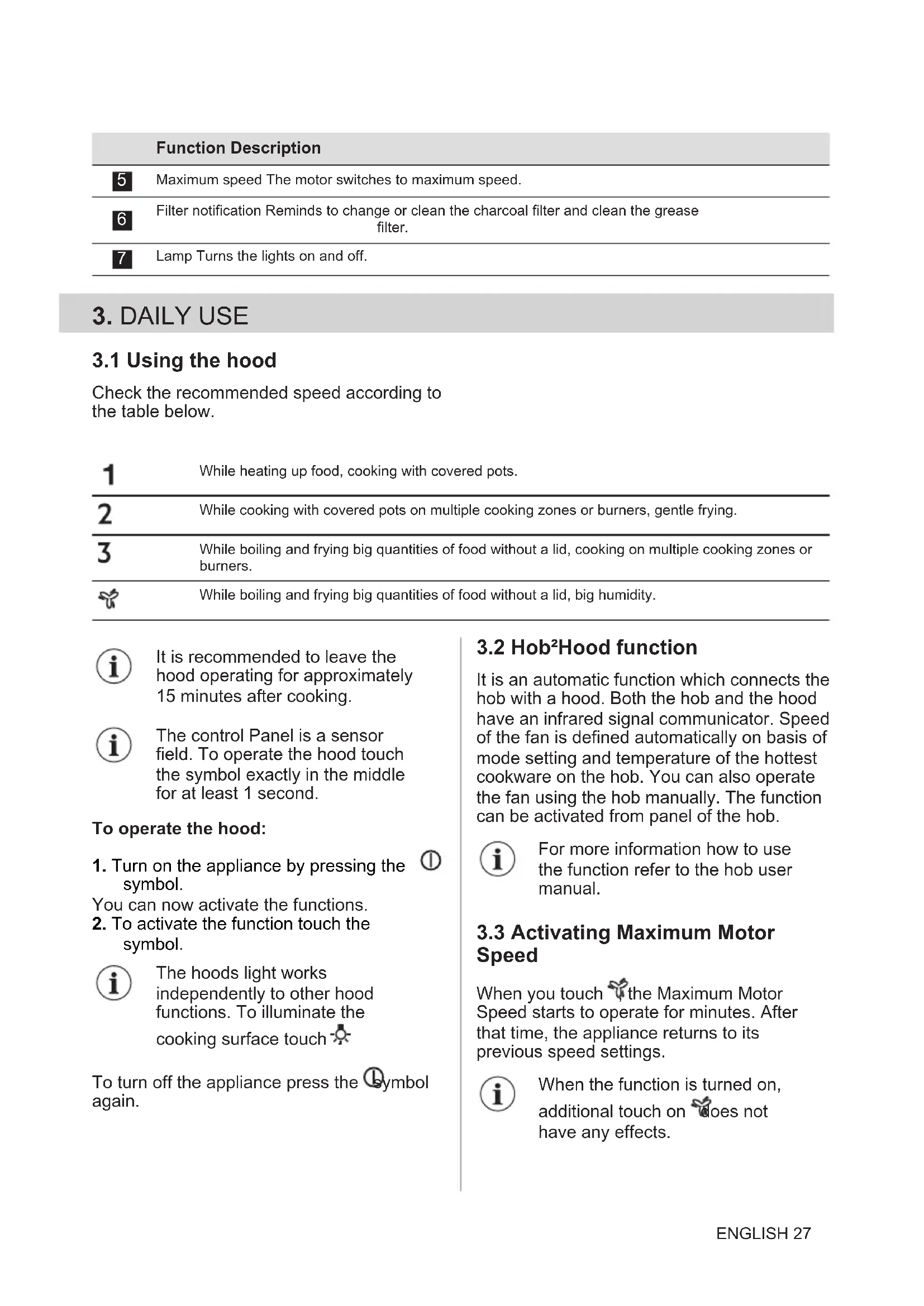 Function Description On / Off Turns the hood on and off. First speed The motor switches to first speed level. Second speed The motor switches to second speed level. Third speed The motor switches to third speed level.26 ENGLISHFunction Description