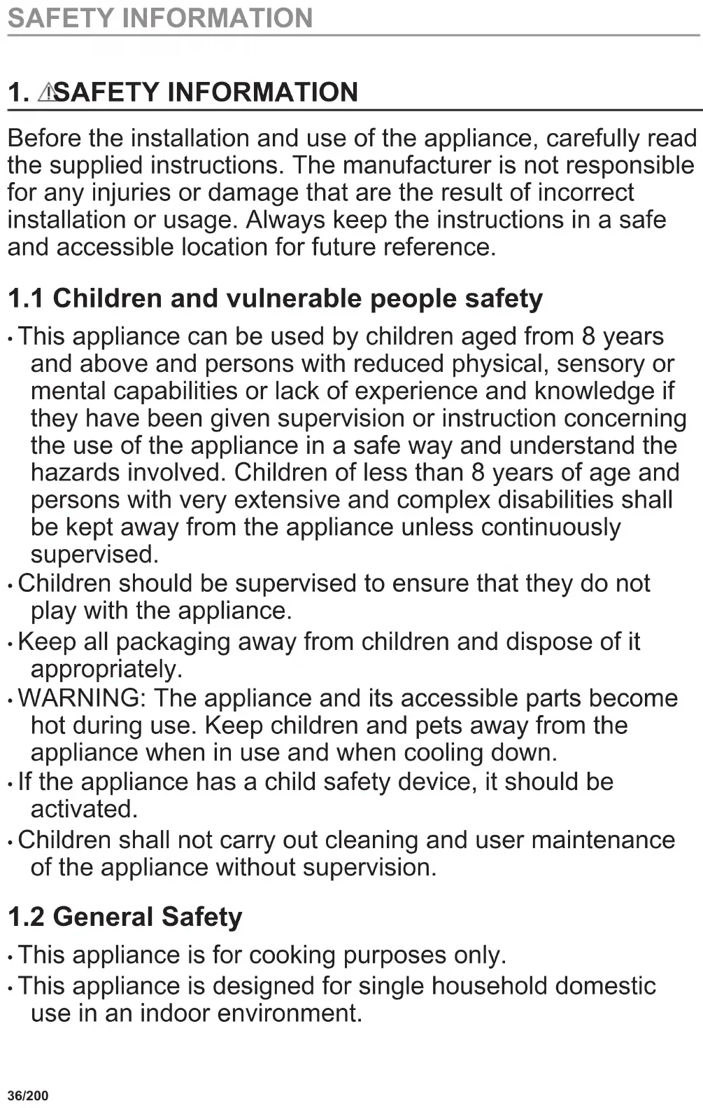- This appliance is designed for single household domestic use in an indoor environment. 36/200 SAFETY INFORMATION• This appliance may be used in, offices, hotel guest rooms, bed & breakfast guest rooms, farm guest houses and other similar accommodation where such use does not exceed (average) domestic usage levels.