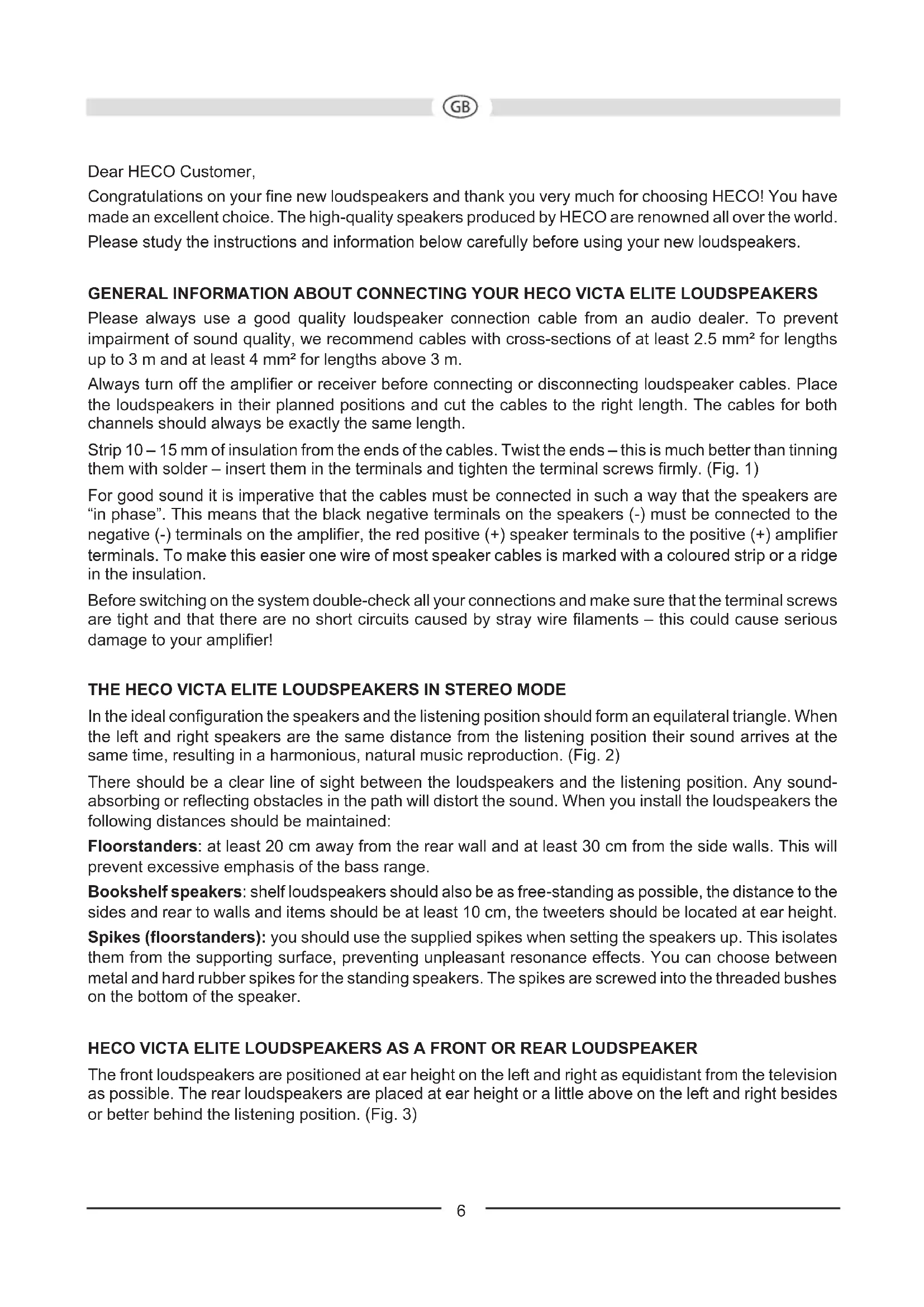 Konfiguration: 3 Wege Bassreflex 2 Wege Bassreflex Belastbarkeit: 170 / 300 Watt 80 / 150 Watt Impedanz: 4 – 8 Ohm 4 – 8 Ohm Frequenzbereich: 25 – 40 000 Hz 35 – 40 000 Hz Empfohlene Verstärkerleistung: 30 – 300 Watt 20 – 150 Watt Wirkungsgrad (2.8V/1m): 91 dB 90 dB Maße (BxHxT): 230 x 1050 x 330 mm 480 x 162 x 260 mm Zubehör: Metallspikes VICTA ELITE 302 Konfiguration: 2 Wege Bassreflex Belastbarkeit: 80 / 150 Watt Impedanz: 4 – 8 Ohm Frequenzbereich: 33 – 40 000 Hz Empfohlene Verstärkerleistung: 30 – 150 Watt Wirkungsgrad (2.8V/1m): 90 dB Maße (BxHxT): 202 x 352 x 310 mm VICTA ELITE 202 Konfiguration: 2 Wege Bassreflex Belastbarkeit: 65 / 120 Watt Impedanz: 4 – 8 Ohm Frequenzbereich: 35 – 40 000 Hz Empfohlene Verstärkerleistung: 20 – 120 Watt Wirkungsgrad (2.8V/1m): 89 dB Maße (BxHxT): 175 x 292 x 225 mm Technische Änderungen vorbehalten. 5Dear HECO Customer, Congratulations on your fine new loudspeakers and thank you very much for choosing HECO! You have made an excellent choice. The high-quality speakers produced by HECO are renowned all over the world. Please study the instructions and information below carefully before using your new loudspeakers. GENERAL INFORMATION ABOUT CONNECTING YOUR HECO VICTA ELITE LOUDSPEAKERS Please always use a good quality loudspeaker connection cable from an audio dealer. To prevent impairment of sound quality, we recommend cables with cross-sections of at least 2.5 mm² for lengths up to 3 m and at least 4 mm² for lengths above 3 m. Always turn off the amplifier or receiver before connecting or disconnecting loudspeaker cables. Place the loudspeakers in their planned positions and cut the cables to the right length. The cables for both channels should always be exactly the same length. Strip 10 – 15 mm of insulation from the ends of the cables. Twist the ends – this is much better than tinning them with solder – insert them in the terminals and tighten the terminal screws firmly. (Fig. 1) For good sound it is imperative that the cables must be connected in such a way that the speakers are “in phase”. This means that the black negative terminals on the speakers (-) must be connected to the negative (-) terminals on the amplifier, the red positive (+) speaker terminals to the positive (+) amplifier terminals. To make this easier one wire of most speaker cables is marked with a coloured strip or a ridge in the insulation. Before switching on the system double-check all your connections and make sure that the terminal screws are tight and that there are no short circuits caused by stray wire filaments – this could cause serious damage to your amplifier! THE HECO VICTA ELITE LOUDSPEAKERS IN STEREO MODE In the ideal configuration the speakers and the listening position should form an equilateral triangle. When the left and right speakers are the same distance from the listening position their sound arrives at the same time, resulting in a harmonious, natural music reproduction. (Fig. 2) There should be a clear line of sight between the loudspeakers and the listening position. Any sound- absorbing or reflecting obstacles in the path will distort the sound. When you install the loudspeakers the following distances should be maintained: Floorstanders: at least 20 cm away from the rear wall and at least 30 cm from the side walls. This will prevent excessive emphasis of the bass range. Bookshelf speakers: shelf loudspeakers should also be as free-standing as possible, the distance to the sides and rear to walls and items should be at least 10 cm, the tweeters should be located at ear height. Spikes (floorstanders): you should use the supplied spikes when setting the speakers up. This isolates them from the supporting surface, preventing unpleasant resonance effects. You can choose between metal and hard rubber spikes for the standing speakers. The spikes are screwed into the threaded bushes on the bottom of the speaker. HECO VICTA ELITE LOUDSPEAKERS AS A FRONT OR REAR LOUDSPEAKER The front loudspeakers are positioned at ear height on the left and right as equidistant from the television as possible. The rear loudspeakers are placed at ear height or a little above on the left and right besides or better behind the listening position. (Fig. 3)