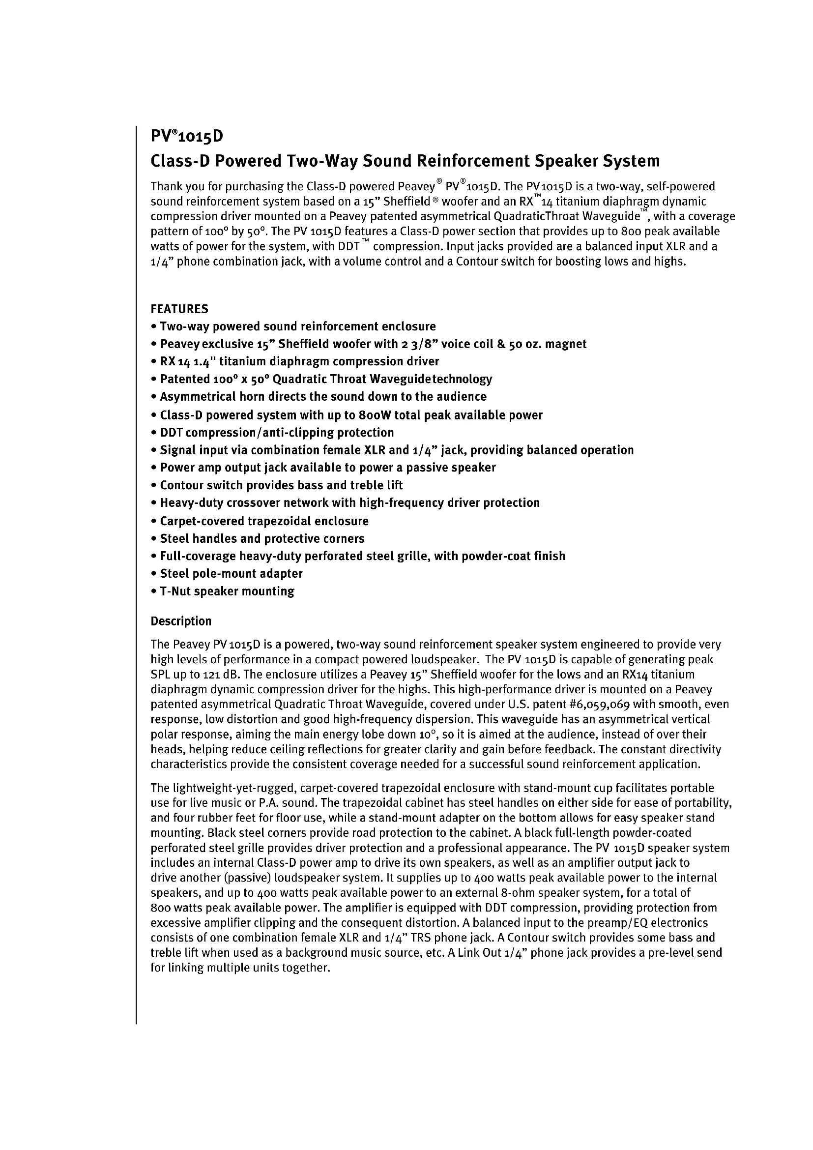 - T-Nut speaker mounting Description The Peavey PV 1015D is a powered, two-way sound reinforcement speaker system engineered to provide very high levels of performance in a compact powered loudspeaker. The PV 1015D is capable of generating peak SPL up to 121 dB. The enclosure utilizes a Peavey 15” Sheffield woofer for the lows and an RX14 titanium diaphragm dynamic compression driver for the highs. This high-performance driver is mounted on a Peavey patented asymmetrical Quadratic Throat Waveguide, covered under U.S. patent #6,059,069 with smooth, even response, low distortion and good high-frequency dispersion. This waveguide has an asymmetrical vertical polar response, aiming the main energy lobe down 10°, so it is aimed at the audience, instead of over their heads, helping reduce ceiling reflections for greater clarity and gain before feedback. The constant directivity characteristics provide the consistent coverage needed for a successful sound reinforcement application. The lightweight-yet-rugged, carpet-covered trapezoidal enclosure with stand-mount cup facilitates portable use for live music or P.A. sound. The trapezoidal cabinet has steel handles on either side for ease of portability, and four rubber feet for floor use, while a stand-mount adapter on the bottom allows for easy speaker stand mounting. Black steel corners provide road protection to the cabinet. A black full-length powder-coated perforated steel grille provides driver protection and a professional appearance. The PV 1015D speaker system includes an internal Class-D power amp to drive its own speakers, as well as an amplifier output jack to drive another (passive) loudspeaker system. It supplies up to 400 watts peak available power to the internal speakers, and up to 400 watts peak available power to an external 8-ohm speaker system, for a total of 800 watts peak available power. The amplifier is equipped with DDT compression, providing protection from excessive amplifier clipping and the consequent distortion. A balanced input to the preamp/EQ electronics consists of one combination female XLR and 1/4” TRS phone jack. A Contour switch provides some bass and treble lift when used as a background music source, etc. A Link Out 1/4” phone jack provides a pre-level send for linking multiple units together.B O T T O M p a n e l Applications Aside from its primary use as a sound reinforcement system, the Peavey