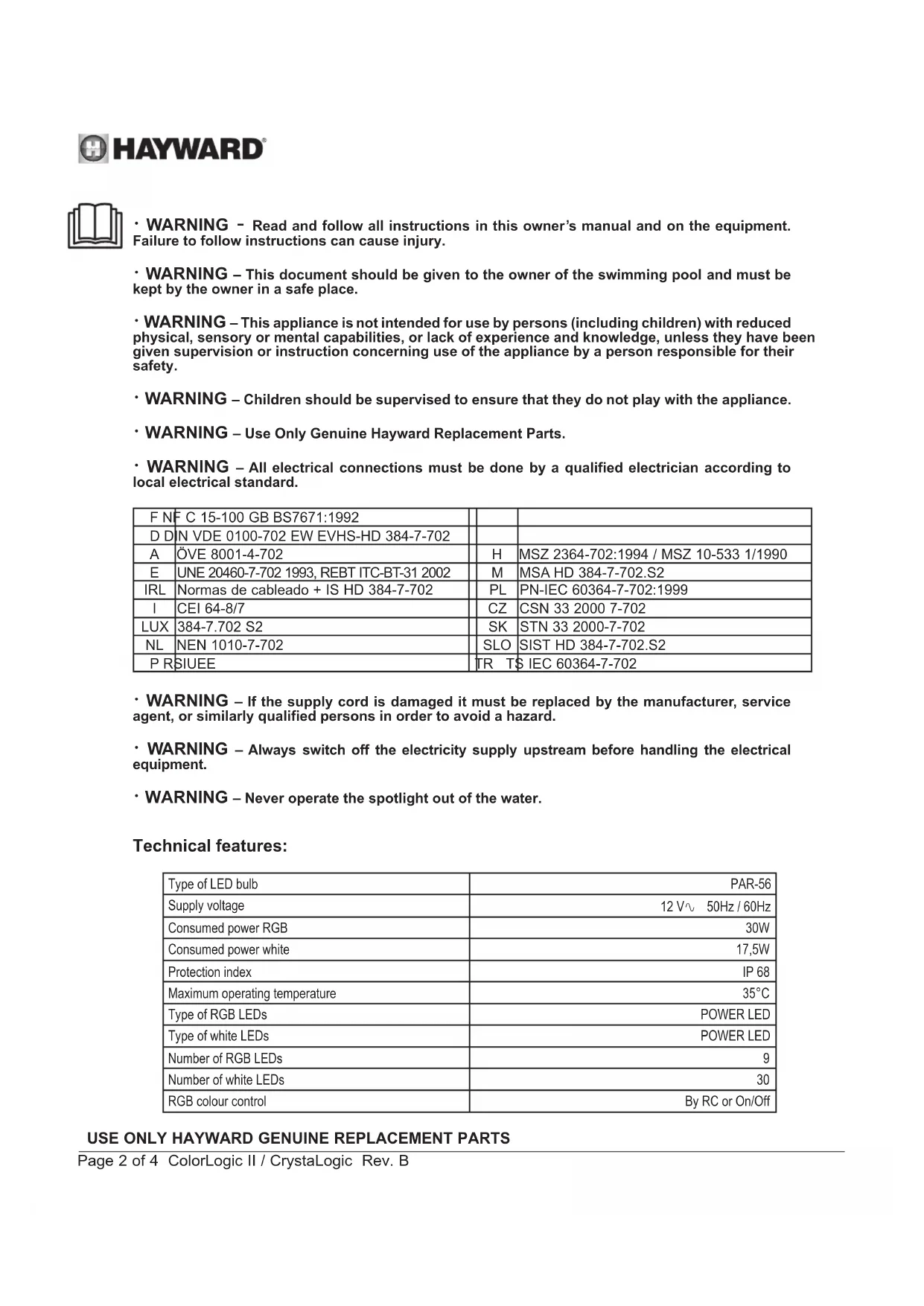 - WARNING – Never operate the spotlight out of the water. Technical features: Type of LED bulb PAR-56 Supply voltage 12 V 50Hz / 60Hz Consumed power RGB 30W Consumed power white 17,5W Protection index IP 68 Maximum operating temperature 35°C Type of RGB LEDs POWER LED Type of white LEDs POWER LED Number of RGB LEDs 9 Number of white LEDs 30 RGB colour control By RC or On/OffUSE ONLY HAYWARD GENUINE REPLACEMENT PARTS Page 3 of 4 ColorLogic II / CrystaLogic Rev. B INSTALLATION The spotlight must shine in the opposite direction to the house or terrace to avoid the lighting being too harsh. The spotlight must be positioned 60cm maximum under the rim of the pool, measured from the axis of the bulb. The spotlight recess is supplied with two 3/4” outputs. The rear output is generally used for brick-built pools and the vertical output for panel-built pools. The junction block is not included. The installation may require the advice of a qualified person. Brick and liner structure