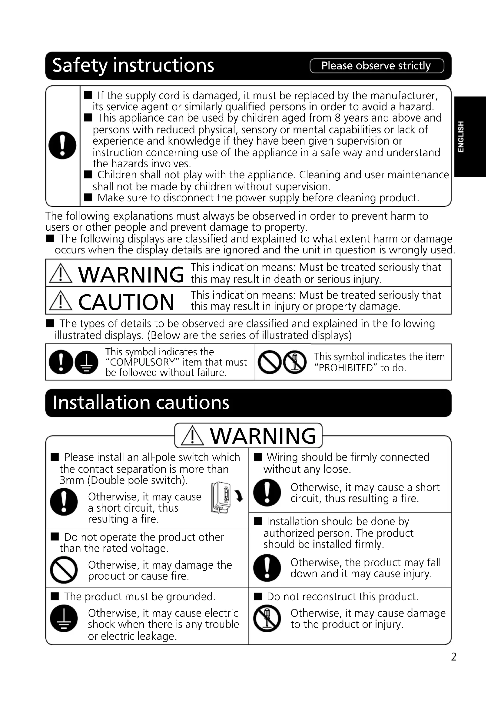installation. Failure to comply with installation and operating instructions could result in personal injury or property damage. Please explain to users how to operate and maintain the product after installation, and this booklet should be presented to users. Please retain this booklet for future reference. 1If the supply cord is damaged, it must be replaced by the manufacturer, its service agent or similarly qualified persons in order to avoid a hazard. This appliance can be used by children aged from 8 years and above and persons with reduced physical, sensory or mental capabilities or lack of experience and knowledge if they have been given supervision or instruction concerning use of the appliance in a safe way and understand the hazards involves. Children shall not play with the appliance. Cleaning and user maintenance shall not be made by children without supervision. Make sure to disconnect the power supply before cleaning product. The following explanations must always be observed in order to prevent harm to users or other people and prevent damage to property. The following displays are classified and explained to what extent harm or damage occurs when the display details are ignored and the unit in question is wrongly used. WARNING This indication means: Must be treated seriously that this may result in death or serious injury. CAUTION This indication means: Must be treated seriously that this may result in injury or property damage. The types of details to be observed are classified and explained in the following illustrated displays. (Below are the series of illustrated displays) This symbol indicates the “COMPULSORY” item that must be followed without failure. This symbol indicates the item “PROHIBITED” to do. Safety instructions Please observe strictly Installation cautions Please install an all-pole switch which the contact separation is more than 3mm (Double pole switch). Otherwise, it may cause a short circuit, thus resulting a fire. Do not operate the product other than the rated voltage. Otherwise, it may damage the product or cause fire. The product must be grounded. Otherwise, it may cause electric shock when there is any trouble or electric leakage. Wiring should be firmly connected without any loose. Otherwise, it may cause a short circuit, thus resulting a fire. Installation should be done by authorized person. The product should be installed firmly. Otherwise, the product may fall down and it may cause injury. Do not reconstruct this product. Otherwise, it may cause damage to the product or injury. WARNING 2Installation cautions Product must be installed by 2 persons. Otherwise, the product may fall down and it may cause injury. The special-purpose or dedicated parts, such as mounting fixtures, must be used if such parts are provided. Otherwise, the product may fall down and it may cause injury. The product must be mounted on a building which is strong enough. To ensure it can bear over 5 times of product weight. The building must be reinforced if its strength can not be ensured. Otherwise, the product may fall down and it may cause injury. Please wear the gloves when installing the product. Otherwise, it may cause damage. CAUTION The product must be installed tightly. Components must be installed tightly. Otherwise, it may injury person caused by product’s falling off. Do not install the product as the method which is not approved in the installation and operating instructions. Otherwise, the product any fall down and it may cause injury. It’s prohibited to install the product in locations such as machinery, chemical plants or research facilities where it will be exposed to noxious gases containing acids, alkali, organic solvents, paint fumes, etc., to gases contaning corrosive ingredients. It could cause gas poisoning, corrosion and degradation of product that results in a fire. WARNING It’s prohibited to install in the following locations. Do not install the product where there is steam. Location with combustible gas or emission of exhaust gas. Do not install the product out of the window and wall. Indoor Outdoor Otherwise, it may cause a short circuit, thus resulting in a fire. Otherwise, it may cause a short circuit, thus resulting in a fire. Otherwise, the product may get wet in the rain and cause a short circuit. 3The following attachments are enclosed in the packing box of product. Be sure to check if they are complete after unpacking, and if anything is missed, contact our After-Sales Service Centre or the dealer. No. Drawing Name Quantity No. Drawing Name Quantity Washer 6 Bolt M8×60L 6 Spring washer