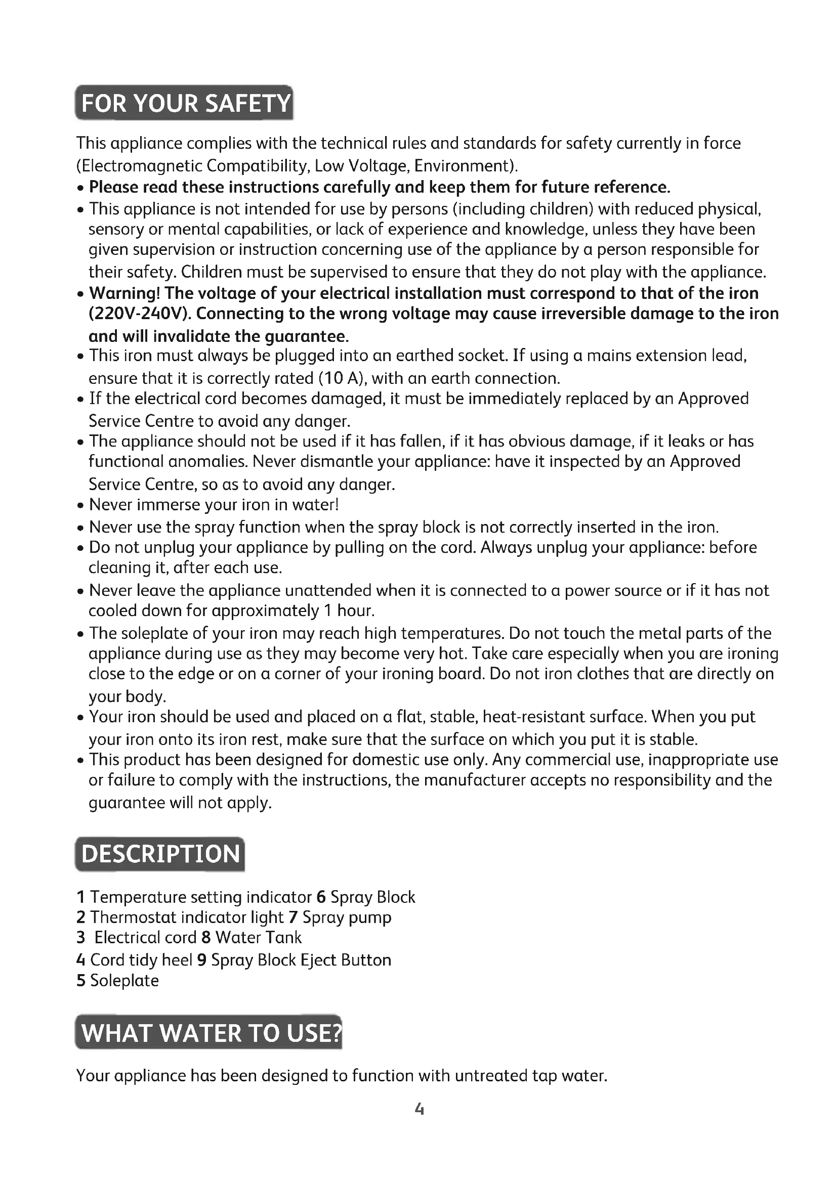 - This product has been designed for domestic use only. Any commercial use, inappropriate use or failure to comply with the instructions, the manufacturer accepts no responsibility and the guarantee will not apply. DESCRIPTION 1 Temperature setting indicator 6 Spray Block 2 Thermostat indicator light 7 Spray pump 3 Electrical cord 8 Water Tank 4 Cord tidy heel 9 Spray Block Eject Button 5 Soleplate WHAT WATER TO USE? Your appliance has been designed to function with untreated tap water. 9100013389 FS45XX_110x154 23/05/13 12:33 Page45