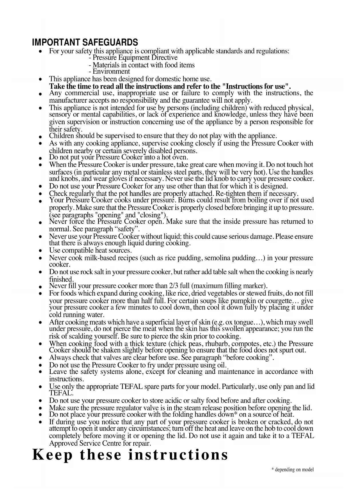 This product has been designed for domestic use only. Any commercial use, inappropriate use or failure to comply with the instructions, the manufacturer accepts no responsibility and the guarantee will not apply. for full details of the terms and conditions of the guarantee please refer to www.tefal.com Standard markings Marking Location Identification of manufacturer or trade mark Locking button Year of manufacture and batch Outside wall of pan (top rim) Model reference Outside wall of pan (top rim) Higher operating pressure (PF) Inside surface of pan clamp hook Maximum safety pressure (PS) Inside surface of pan clamp hook Capacity Outside bottom of pan