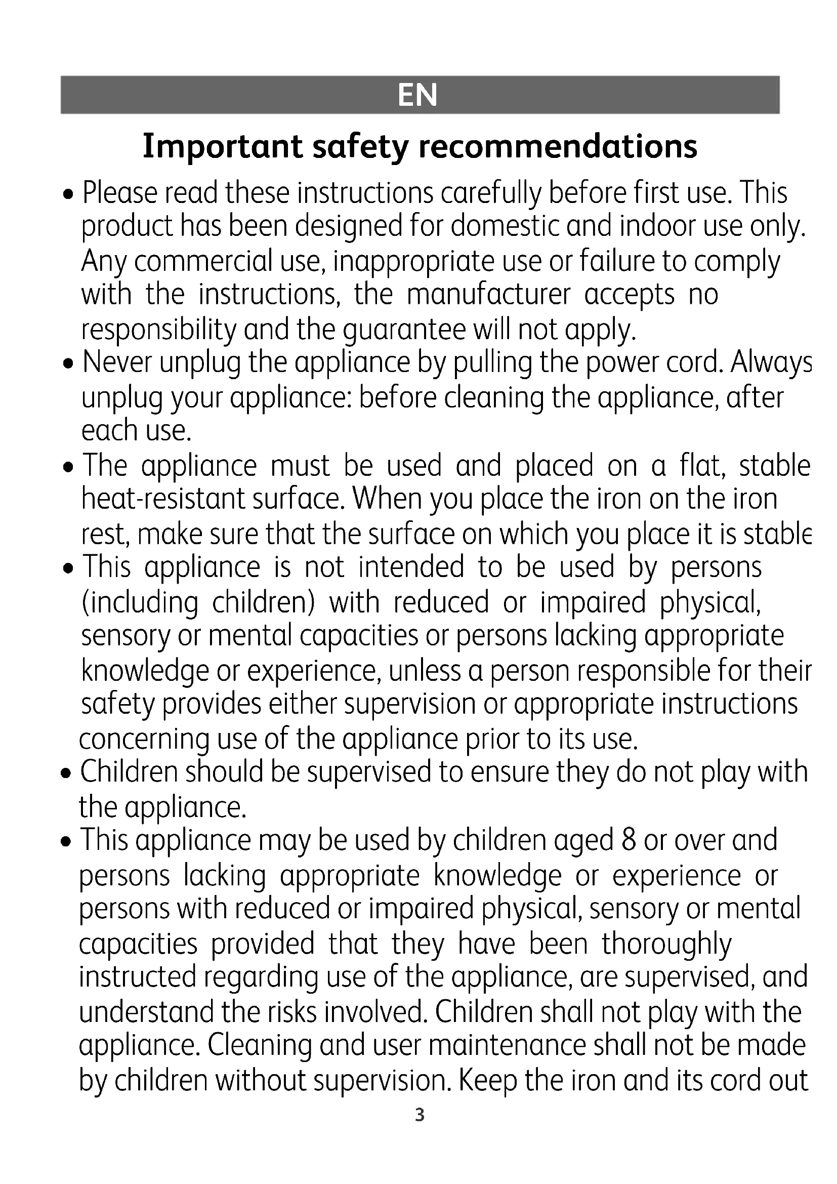 - This appliance may be used by children aged 8 or over and persons lacking appropriate knowledge or experience or persons with reduced or impaired physical, sensory or mental capacities provided that they have been thoroughly instructed regarding use of the appliance, are supervised, and understand the risks involved. Children shall not play with the appliance. Cleaning and user maintenance shall not be made by children without supervision. Keep the iron and its cord out 1800139279-01 FV26XX TEF.qxp_110x154 17/05/2016 16:06 Page3EN