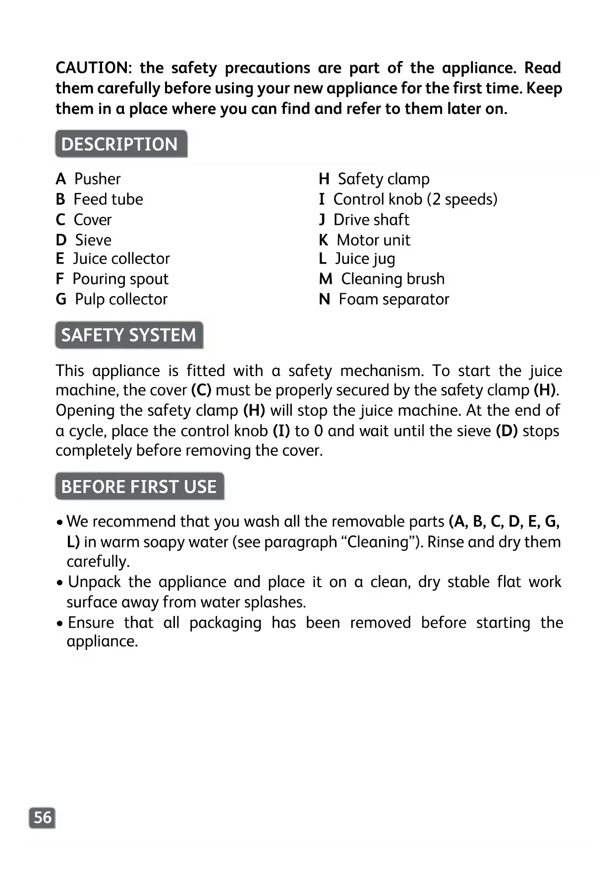 A Pusher B Feed tube C Cover D Sieve E Juice collector F Pouring spout G Pulp collector H Safety clamp I Control knob (2 speeds) J Drive shaft K Motor unit L Juice jug M Cleaning brush N Foam separator This appliance is fitted with a safety mechanism. To start the juice machine, the cover (C) must be properly secured by the safety clamp (H). Opening the safety clamp (H) will stop the juice machine. At the end of a cycle, place the control knob (I) to 0 and wait until the sieve (D) stops completely before removing the cover. CAUTION: the safety precautions are part of the appliance. Read them carefully before using your new appliance for the first time. Keep them in a place where you can find and refer to them later on.