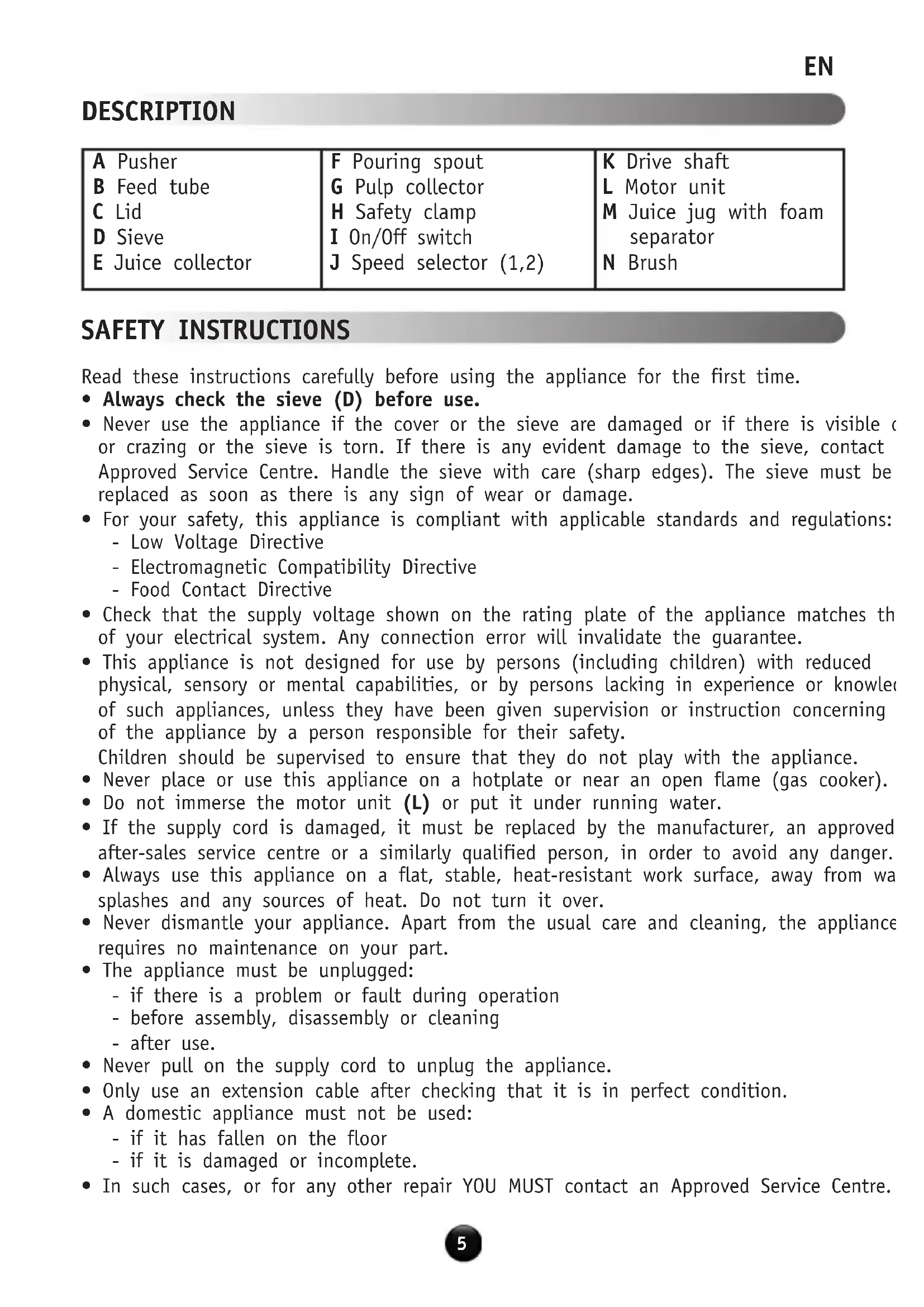 SAFETY INSTRUCTIONS A Pusher B Feed tube C Lid D Sieve E Juice collector F Pouring spout G Pulp collector H Safety clamp I On/Off switch J Speed selector (1,2) K Drive shaft L Motor unit M Juice jug with foam separator N Brush Read these instructions carefully before using the appliance for the first time.