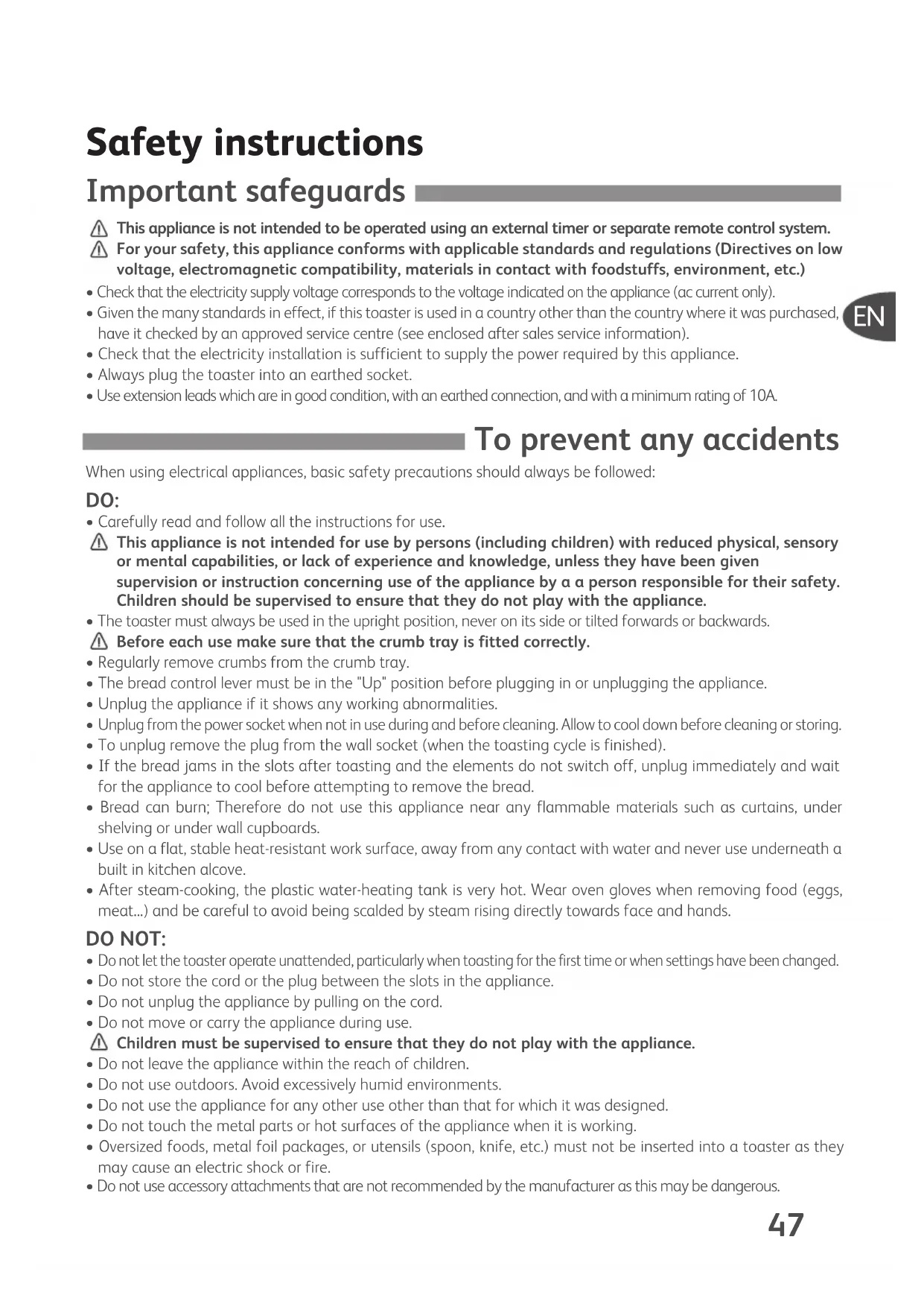 TOASTN'EGG-NC00013044:Mise en page 1 16/10/09 10:38 Page 46Safety instructions This appliance is not intended to be operated using an external timer or separate remote control system. For your safety, this appliance conforms with applicable standards and regulations (Directives on low voltage, electromagnetic compatibility, materials in contact with foodstuffs, environment, etc.)