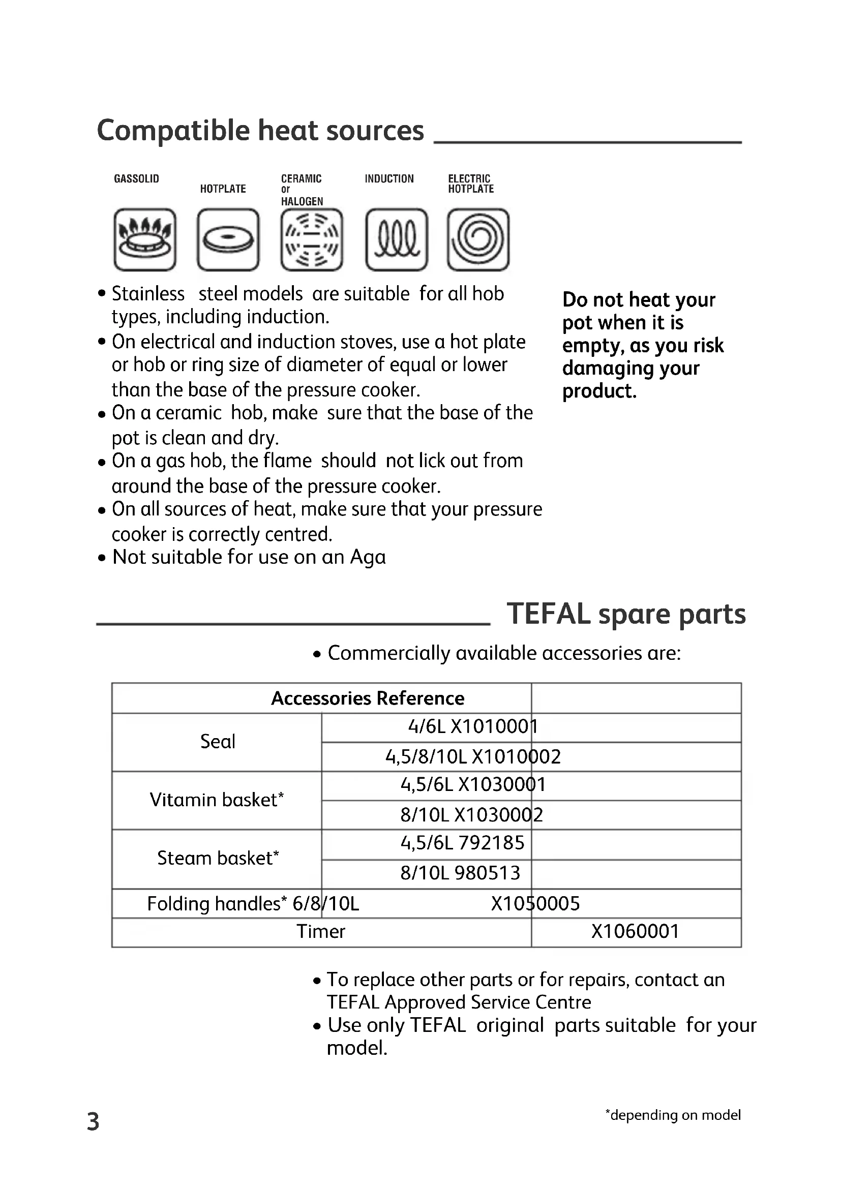 - Use only the appropriate TEFAL spare parts for your model. Particularly, only the TEFAL pan and lid.