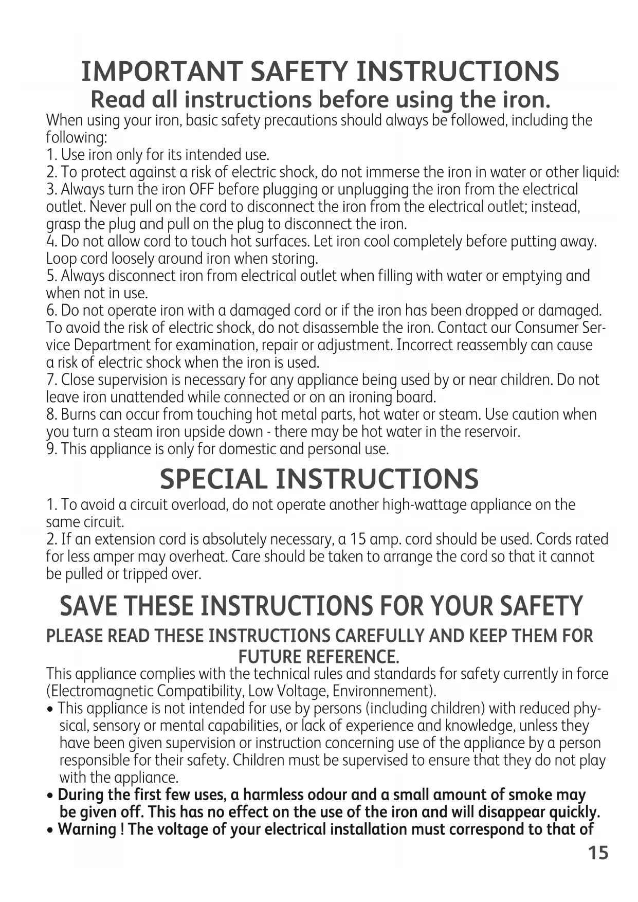 PLEASE READ THESE INSTRUCTIONS CAREFULLY AND KEEP THEM FOR FUTURE REFERENCE. This appliance complies with the technical rules and standards for safety currently in force (Electromagnetic Compatibility, Low Voltage, Environnement).