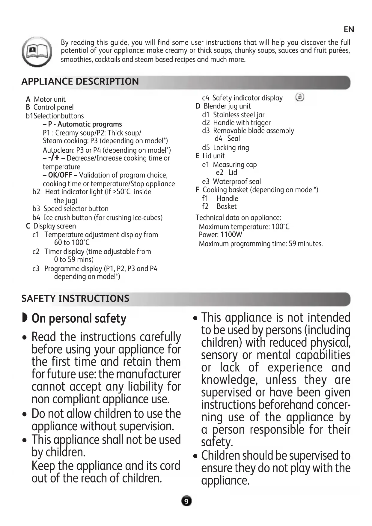 By reading this guide, you will find some user instructions that will help you discover the full potential of your appliance: make creamy or thick soups, chunky soups, sauces and fruit purées, smoothies, cocktails and steam based recipes and much more.