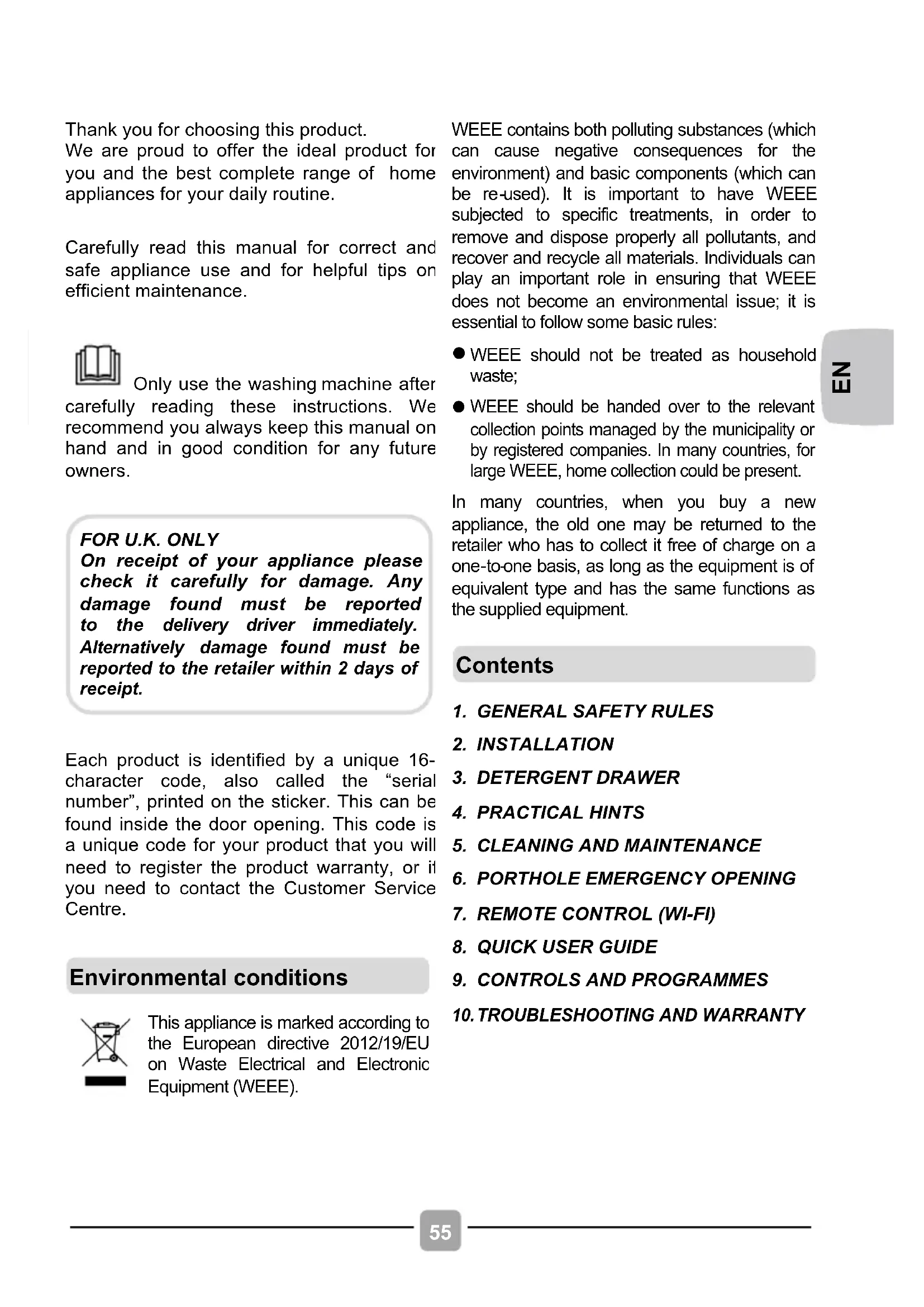 Only use the washing machine after carefully reading these instructions. We recommend you always keep this manual on hand and in good condition for any future owners.