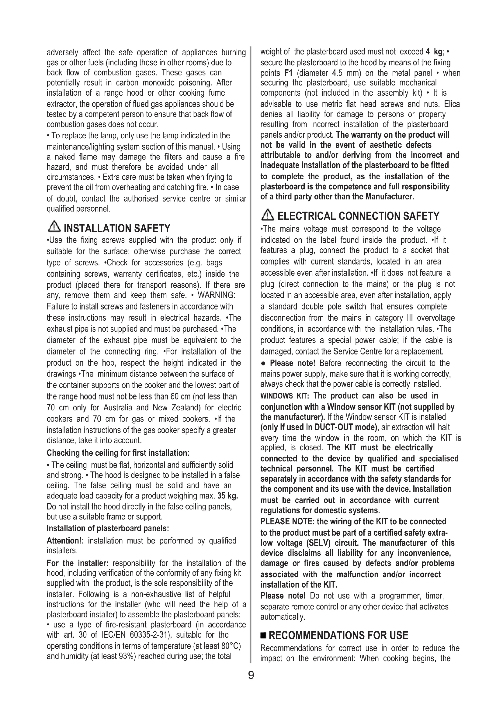 - The regulations laid down by local authorities must be strictly followed with regard to the technical and safety measures to adopt for fume extraction. •The extracted air must not be conveyed through the same ducts used to extract the fumes generated by gas combustion or other types of combustion products. •Do not use or leave the product without appropriately installed lamps, as this may result in the risk of electric shock. •The product must NEVER be used without the grille correctly fitted. •The product must NEVER be used as a support surface unless expressly indicated. ● Range hoods and other cooking fume extractors may 8adversely affect the safe operation of appliances burning gas or other fuels (including those in other rooms) due to back flow of combustion gases. These gases can potentially result in carbon monoxide poisoning. After installation of a range hood or other cooking fume extractor, the operation of flued gas appliances should be tested by a competent person to ensure that back flow of combustion gases does not occur.