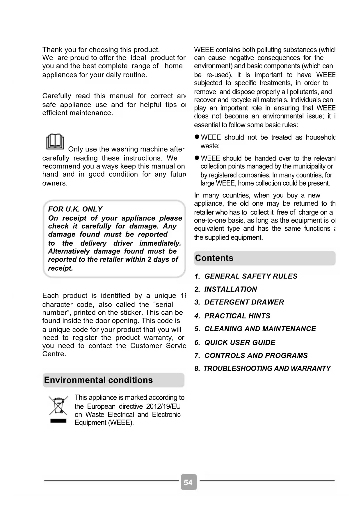 Thank you for choosing this product. We are proud to offer the ideal product for you and the best complete range of home appliances for your daily routine. Carefully read this manual for correct and safe appliance use and for helpful tips on efficient maintenance. Only use the washing machine after carefully reading these instructions. We recommend you always keep this manual on hand and in good condition for any future owners.