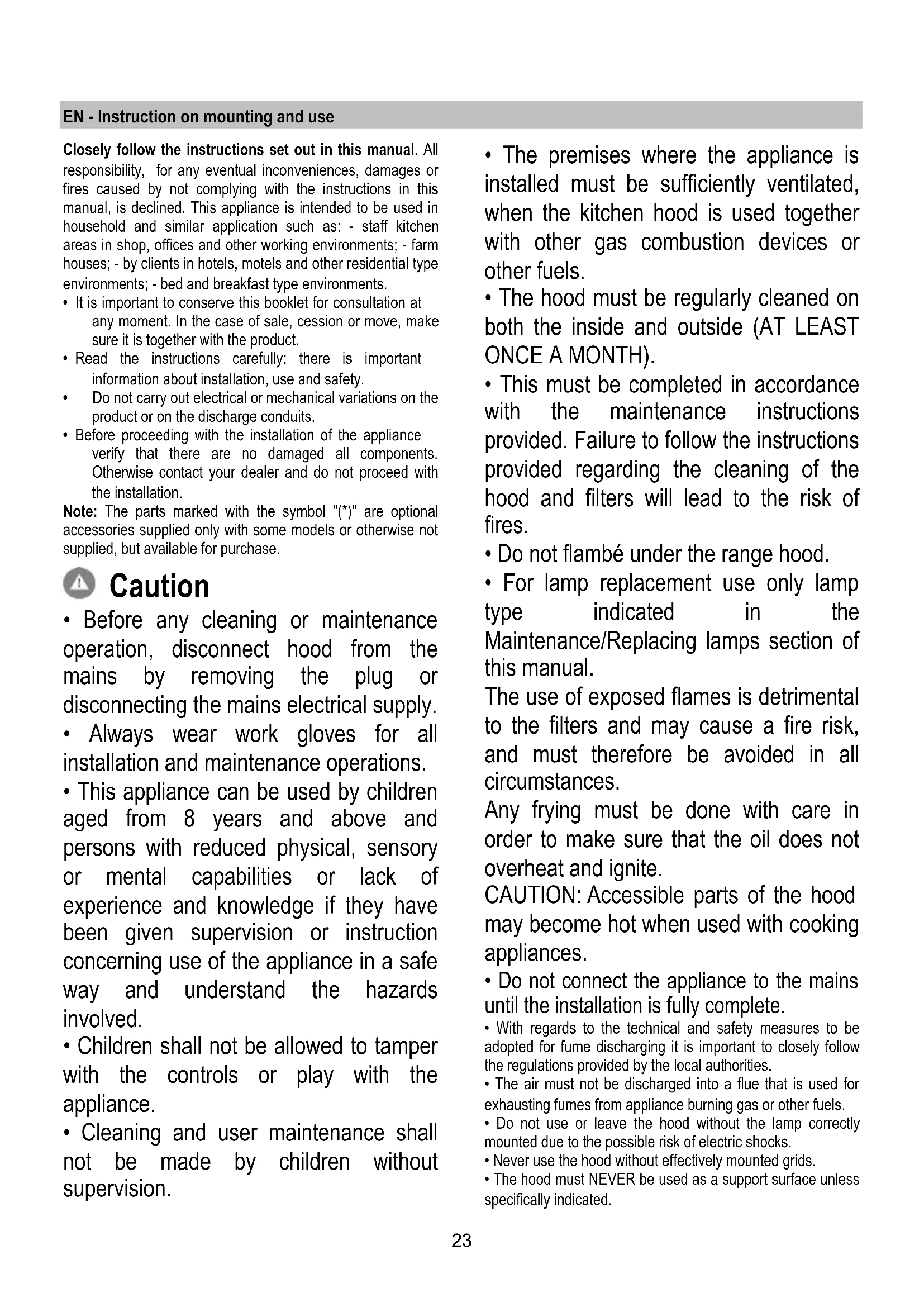 Gitter wieder einbauen. Sollte die Beleuchtung nicht funktionieren, erst kontrollieren, ob die Lampen einwandfrei eingesetzt sind, bevor man sich an den Kundendienst wendet.23 EN - Instruction on mounting and use Closely follow the instructions set out in this manual. All responsibility, for any eventual inconveniences, damages or fires caused by not complying with the instructions in this manual, is declined. This appliance is intended to be used in household and similar application such as: - staff kitchen areas in shop, offices and other working environments; - farm houses; - by clients in hotels, motels and other residential type environments; - bed and breakfast type environments.