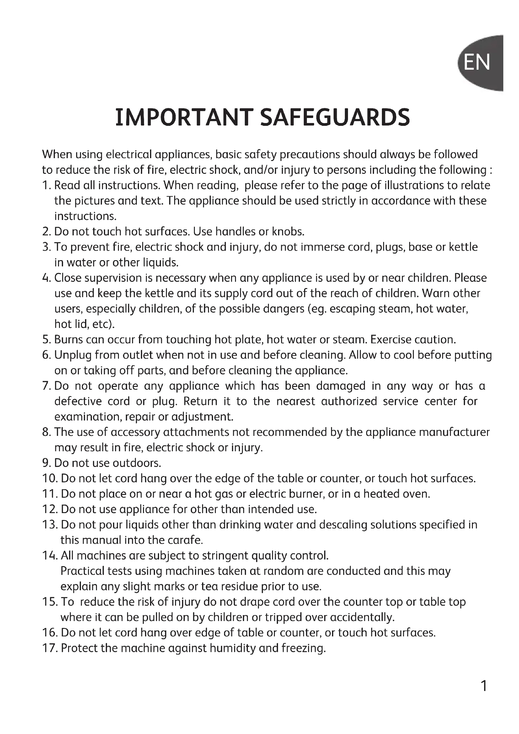 use and keep the kettle and its supply cord out of the reach of children. Warn other users, especially children, of the possible dangers (eg. escaping steam, hot water, hot lid, etc).