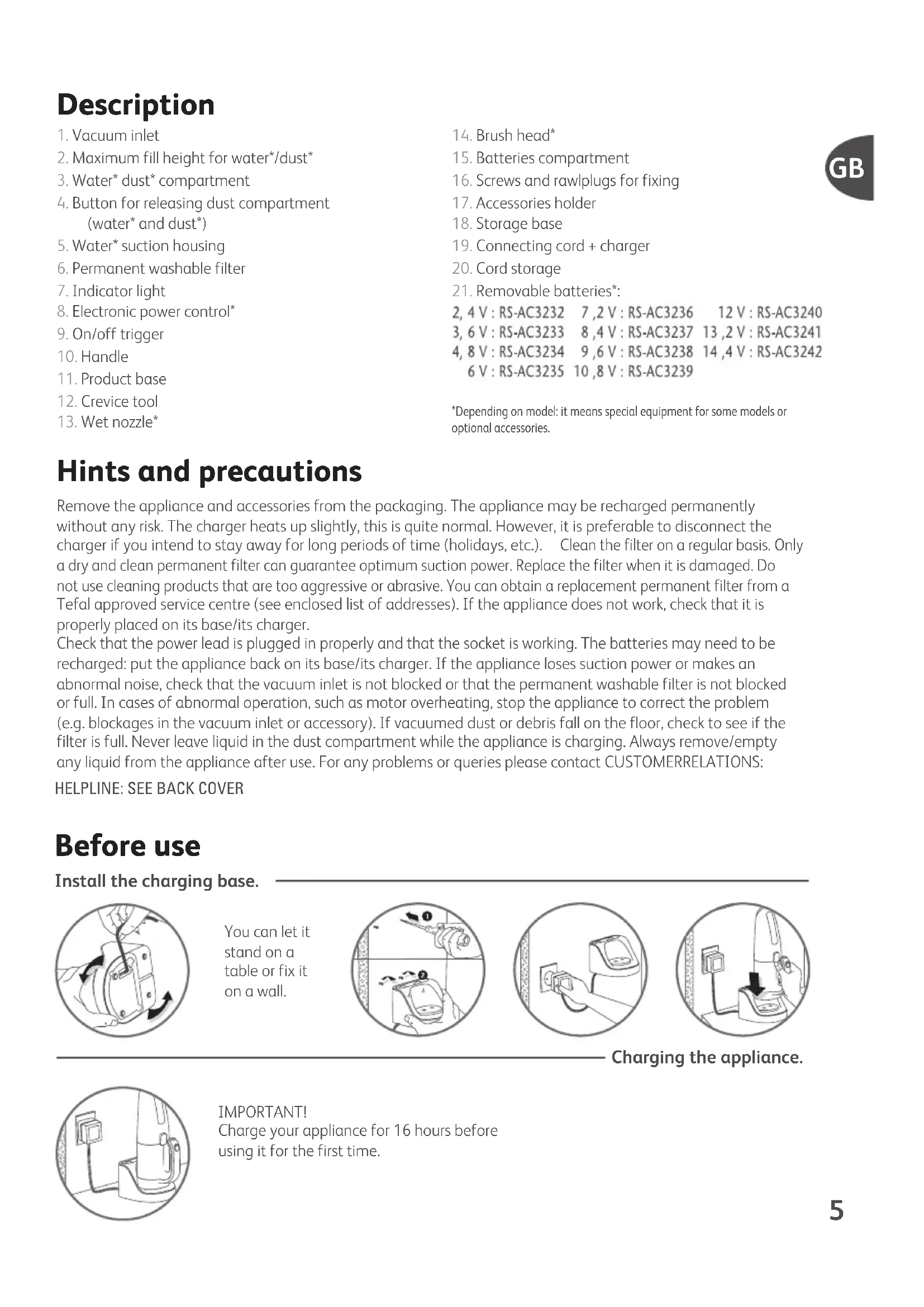 Hints and precautions Remove the appliance and accessories from the packaging. The appliance may be recharged permanently without any risk. The charger heats up slightly, this is quite normal. However, it is preferable to disconnect the charger if you intend to stay away for long periods of time (holidays, etc.). Clean the filter on a regular basis. Only a dry and clean permanent filter can guarantee optimum suction power. Replace the filter when it is damaged. Do not use cleaning products that are too aggressive or abrasive. You can obtain a replacement permanent filter from a Tefal approved service centre (see enclosed list of addresses). If the appliance does not work, check that it is properly placed on its base/its charger. Check that the power lead is plugged in properly and that the socket is working. The batteries may need to be recharged: put the appliance back on its base/its charger. If the appliance loses suction power or makes an abnormal noise, check that the vacuum inlet is not blocked or that the permanent washable filter is not blocked or full. In cases of abnormal operation, such as motor overheating, stop the appliance to correct the problem (e.g. blockages in the vacuum inlet or accessory). If vacuumed dust or debris fall on the floor, check to see if the filter is full. Never leave liquid in the dust compartment while the appliance is charging. Always remove/empty any liquid from the appliance after use. For any problems or queries please contact CUSTOMERRELATIONS: