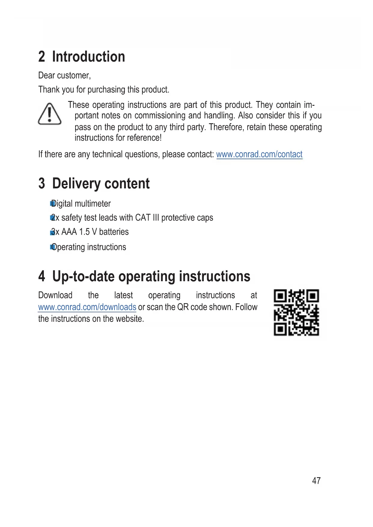 16 Troubleshooting ...........................................................................................80 17 Technical data ..............................................................................................8147 2 Introduction Dear customer, Thank you for purchasing this product. These operating instructions are part of this product. They contain im- portant notes on commissioning and handling. Also consider this if you pass on the product to any third party. Therefore, retain these operating instructions for reference! If there are any technical questions, please contact: www.conrad.com/contact 3 Delivery content