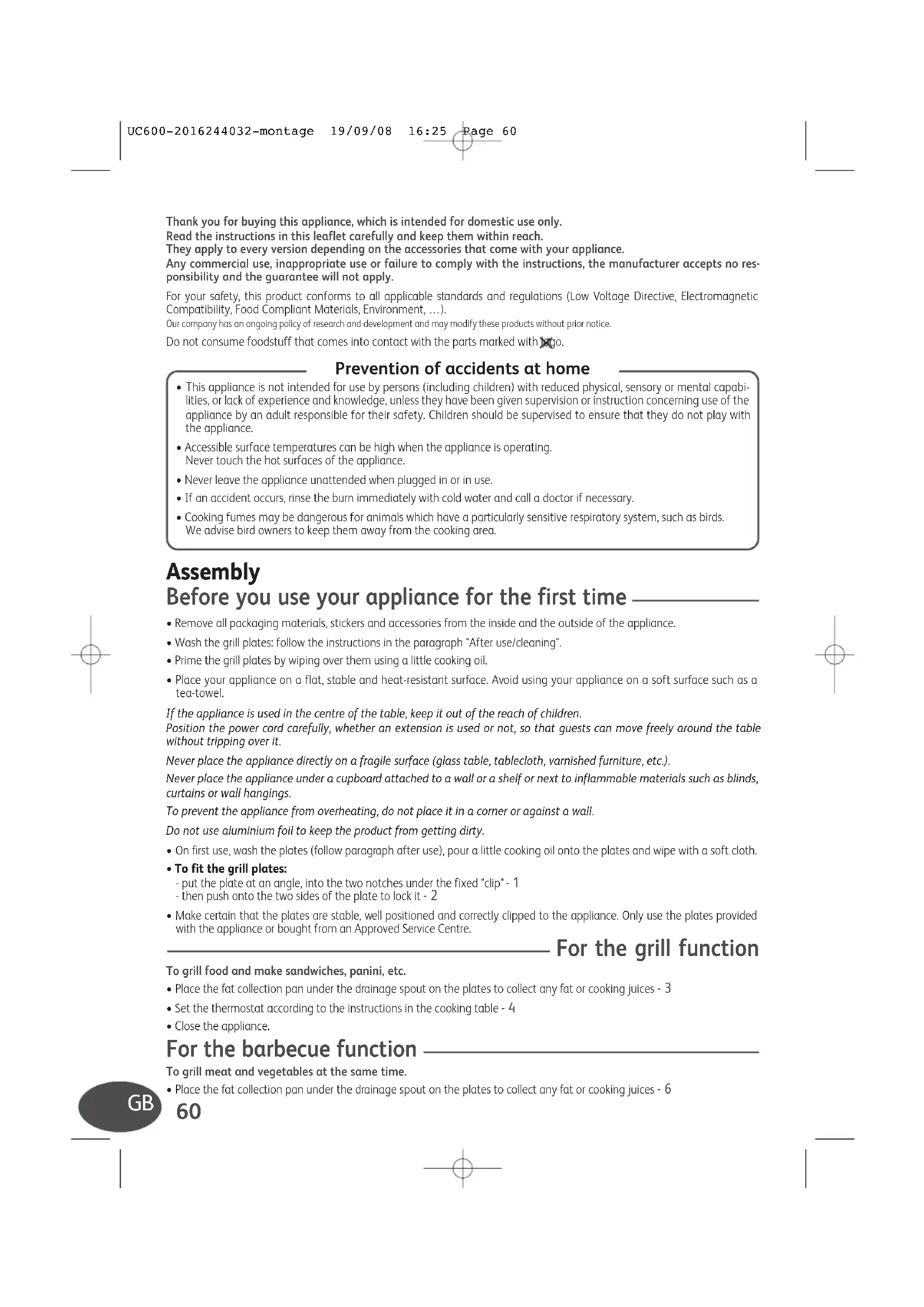 UC600-2016244032-montage 19/09/08 16:25 Page 62Reheating cooked dishes (in accordance with the model) Thermostat Max Function Cooking time Frozen dishes (about 500g) oven 30-45 min Fresh products (about 500g) oven 20-30 min Cooking tables Cooking times are given as an indication only: they can vary according to quantity, personal taste, size of the pieces and type of food. Meat and skewered kebabs Thermostat 3 Function Cooking time Beef rib steaks grill 9-11 min Beef fillets grill 3-4 min Tournedos grill 4-5 min Veal rib steaks barbecue 8-9 min/side Lamb chops barbecue 7-8 min/side Rump steak grill 3-4 min Hamburger patties grill 4 min Sausages grill 7-9 min Lamb skewered kebabs barbecue 20-22 min Liver/kidney skewered kebabs barbecue 20-25 min Chicken skewered kebabs barbecue 20-25 min Cocktail sausages barbecue 7-9 min Fish Thermostat 3 Function Cooking time Sole barbecue 6-7 min/side Sardine fillets barbecue 4-5 min/side Salmon steaks barbecue 5-6 min/side Vegetables Thermostat 3 Function Cooking time Mushrooms barbecue 5-7 min/side Tomatoes barbecue 5-7 min/side Courgettes barbecue 5-10 min/side Aubergines barbecue 5-10 min/side Sandwiches Thermostat 2 Function Cooking time Panini grill 7-9 min Pre-toasted sandwich grill 4-5 min Environment protection first ! Your appliance contains valuable materials which can be recovered or recycled. Leave it at a local civic waste collection point..For any product problems or queries, pleasecontact our Customer Relations Team on:0845 602 1454 - UK(01) 401 8448 - Ireland