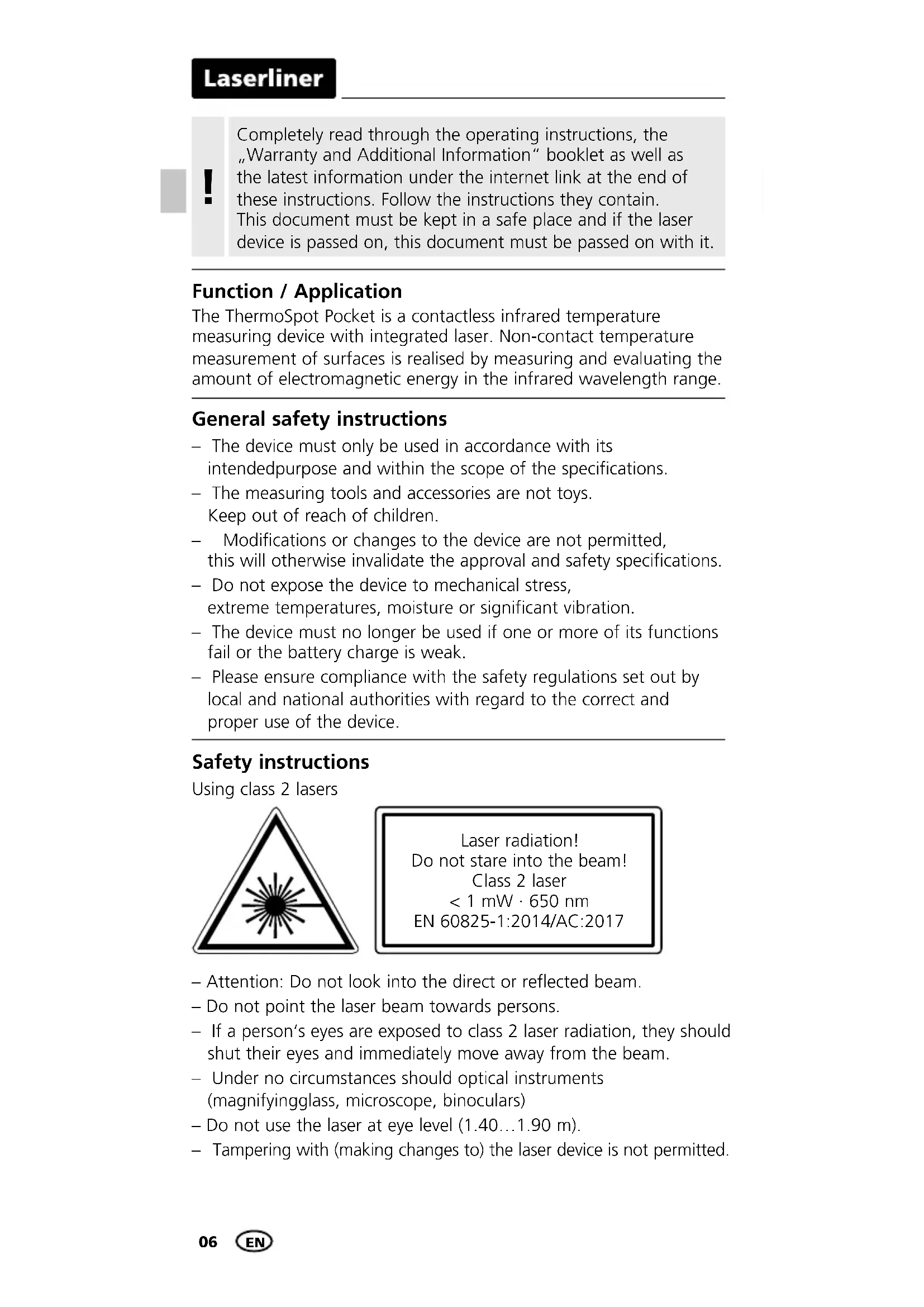 Tampering with (making changes to) the laser device is not permitted. Using class 2 lasers Laser radiation! Do not stare into the beam! Class 2 laser < 1 mW · 650 nm EN 60825-1:2014/AC:2017ThermoSpot Pocket