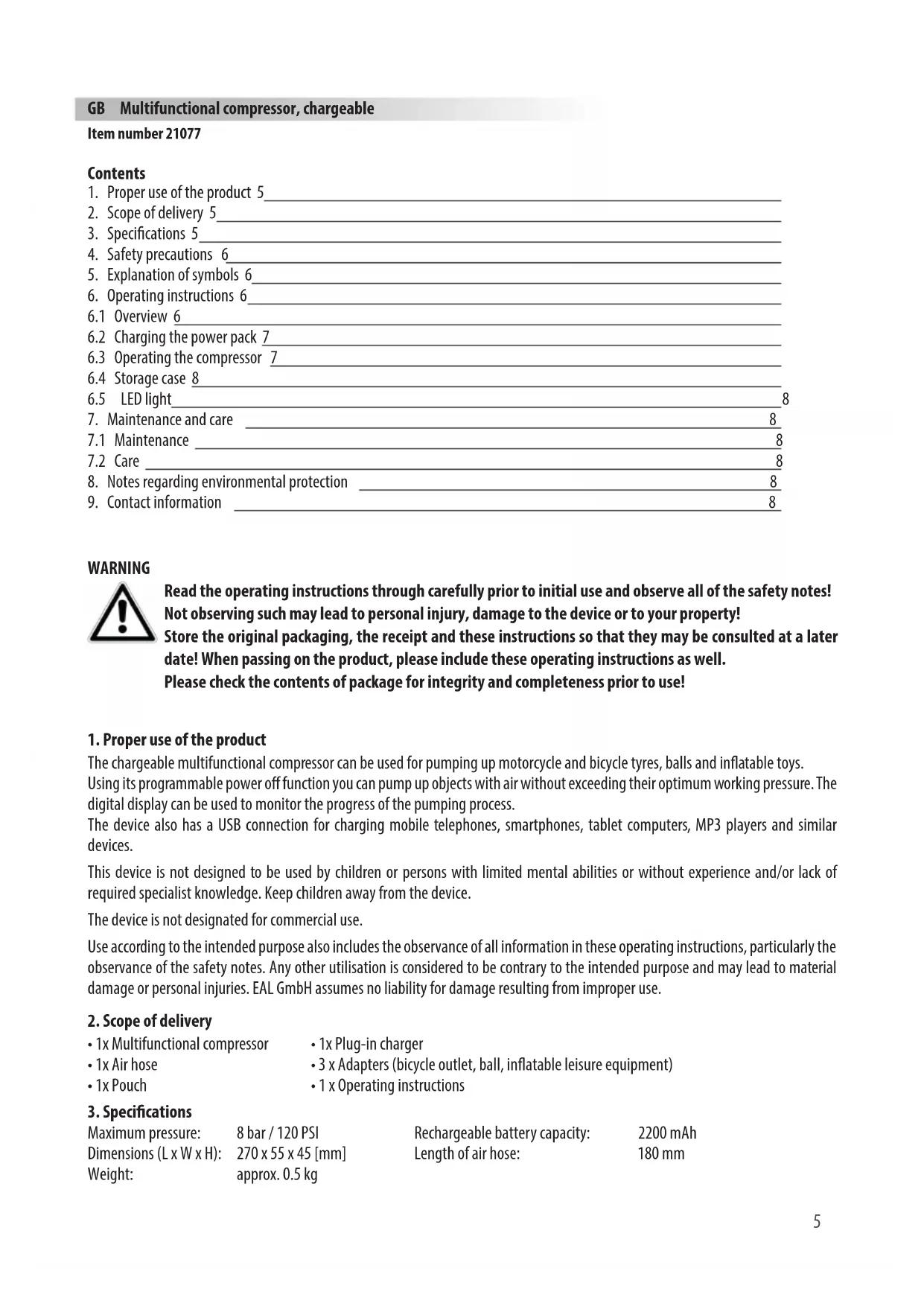 The chargeable multifunctional compressor can be used for pumping up motorcycle and bicycle tyres, balls and inatable toys. Using its programmable power o function you can pump up objects with air without exceeding their optimum working pressure. The digital display can be used to monitor the progress of the pumping process. The device also has a USB connection for charging mobile telephones, smartphones, tablet computers, MP3 players and similar devices. This device is not designed to be used by children or persons with limited mental abilities or without experience and/or lack of required specialist knowledge. Keep children away from the device. The device is not designated for commercial use. Use according to the intended purpose also includes the observance of all information in these operating instructions, particularly the observance of the safety notes. Any other utilisation is considered to be contrary to the intended purpose and may lead to material damage or personal injuries. EAL GmbH assumes no liability for damage resulting from improper use. GB Multifunctional compressor, chargeable Item number 21077