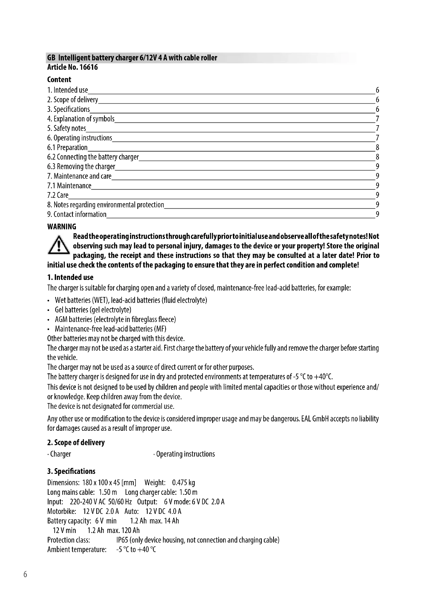 - Maintenance-free lead-acid batteries (MF) Other batteries may not be charged with this device. The charger may not be used as a starter aid. First charge the battery of your vehicle fully and remove the charger before starting the vehicle. The charger may not be used as a source of direct current or for other purposes. The battery charger is designed for use in dry and protected environments at temperatures of -5 °C to +40°C. This device is not designed to be used by children and people with limited mental capacities or those without experience and/ or knowledge. Keep children away from the device. The device is not designated for commercial use. Any other use or modication to the device is considered improper usage and may be dangerous. EAL GmbH accepts no liability for damages caused as a result of improper use.