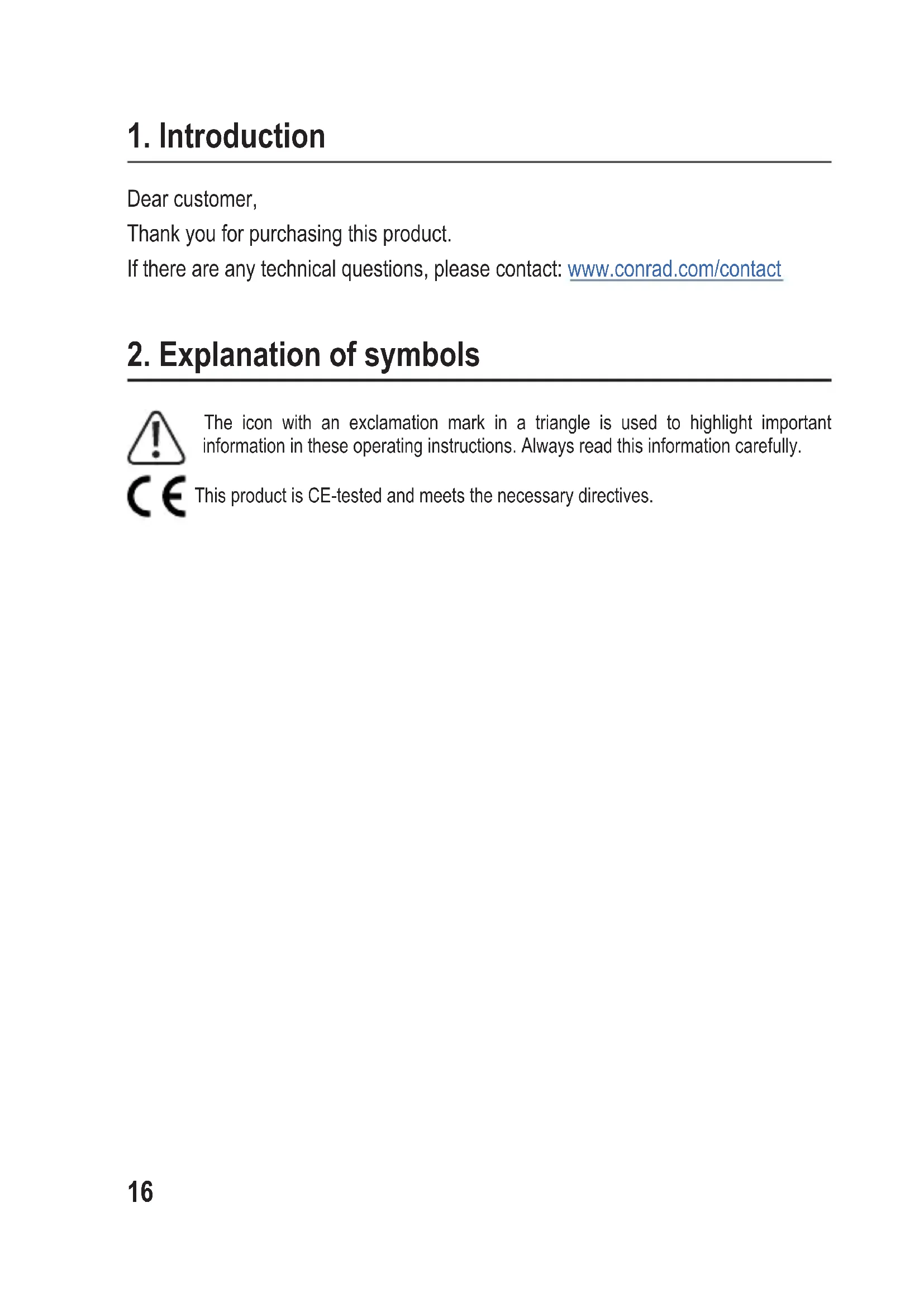 The icon with an exclamation mark in a triangle is used to highlight important information in these operating instructions. Always read this information carefully. This product is CE-tested and meets the necessary directives.