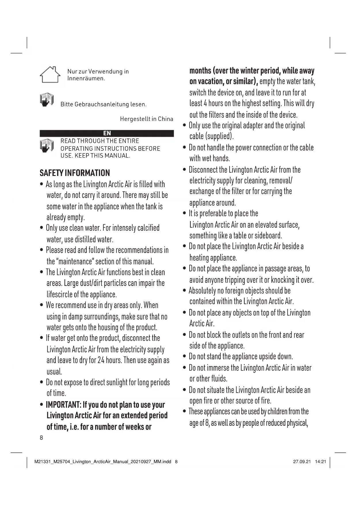 - These appliances can be used by children from the age of 8, as well as by people of reduced physical, M21331_M25704_Livington_ArcticAir_Manual_20210927_MM.indd 8M21331_M25704_Livington_ArcticAir_Manual_20210927_MM.indd 8 27.09.21 14:2127.09.21 14:219 sensory or mental capabilities or lack of experience and/or knowledge provided they have been supervised or instructed in respect of the safe use of the appliance and have understood the possible resulting dangers. Children must not play with the appliance. Cleaning and user-maintenance must not be carried out by children, unless they are older than 8 years and supervised. Children younger than 8 years are to be kept away from the appliance and the connection cable. The most extreme care is required when an air conditioning unit is to be used within the vicinity of children and if it is to be left operating while unsupervised.