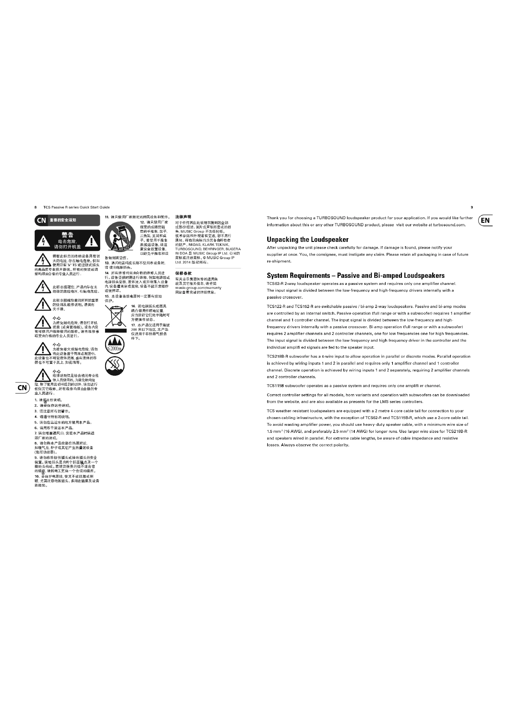 Thank you for choosing a TURBOSOUND loudspeaker product for your application. If you would like further information about this or any other TURBOSOUND product, please visit our website at turbosound.com. Unpacking the Loudspeaker After unpacking the unit please check carefully for damage. If damage is found, please notify your supplier at once. You, the consignee, must instigate any claim. Please retain all packaging in case of future re-shipment. System Requirements – Passive and Bi-amped Loudspeakers TCS62-R 2-way loudspeaker operates as a passive system and requires only one amplifi er channel. The input signal is divided between the low-frequency and high-frequency drivers internally with a passive crossover. TCS122-R and TCS152-R are switchable passive / bi-amp 2-way loudspeakers. Passive and bi-amp modes are controlled by an internal switch. Passive operation (full range or with a subwoofer) requires 1 amplifi er channel and 1 controller channel. The input signal is divided between the low-frequency and high- frequency drivers internally with a passive crossover. Bi-amp operation (full range or with a subwoofer) requires 2 amplifi er channels and 2 controller channels, one for low frequencies one for high frequencies. The input signal is divided between the low frequency and high frequency driver in the controller and the individual amplifi ed signals are fed to the speaker input. TCS218B-R subwoofer has a 4-wire input to allow operation in parallel or discrete modes. Parallel operation is achieved by wiring inputs 1 and 2 in parallel and requires only 1 amplifi er channel and 1 controller channel. Discrete operation is achieved by wiring inputs 1 and 2 separately, requiring 2 amplifi er channels and 2 controller channels. TCS115B subwoofer operates as a passive system and requires only one amplifi er channel. Correct controller settings for all models, horn variants and operation with subwoofers can be downloaded from the website, and are also available as presents for the LMS series controllers. TCS weather-resistant loudspeakers are equipped with a 2 metre 4-core cable tail for connection to your chosen cabling infrastructure, with the exception of TCS62-R and TCS115B-R, which use a 2-core cable tail. To avoid wasting amplifi er power, you should use heavy-duty speaker cable, with a minimum wire size of